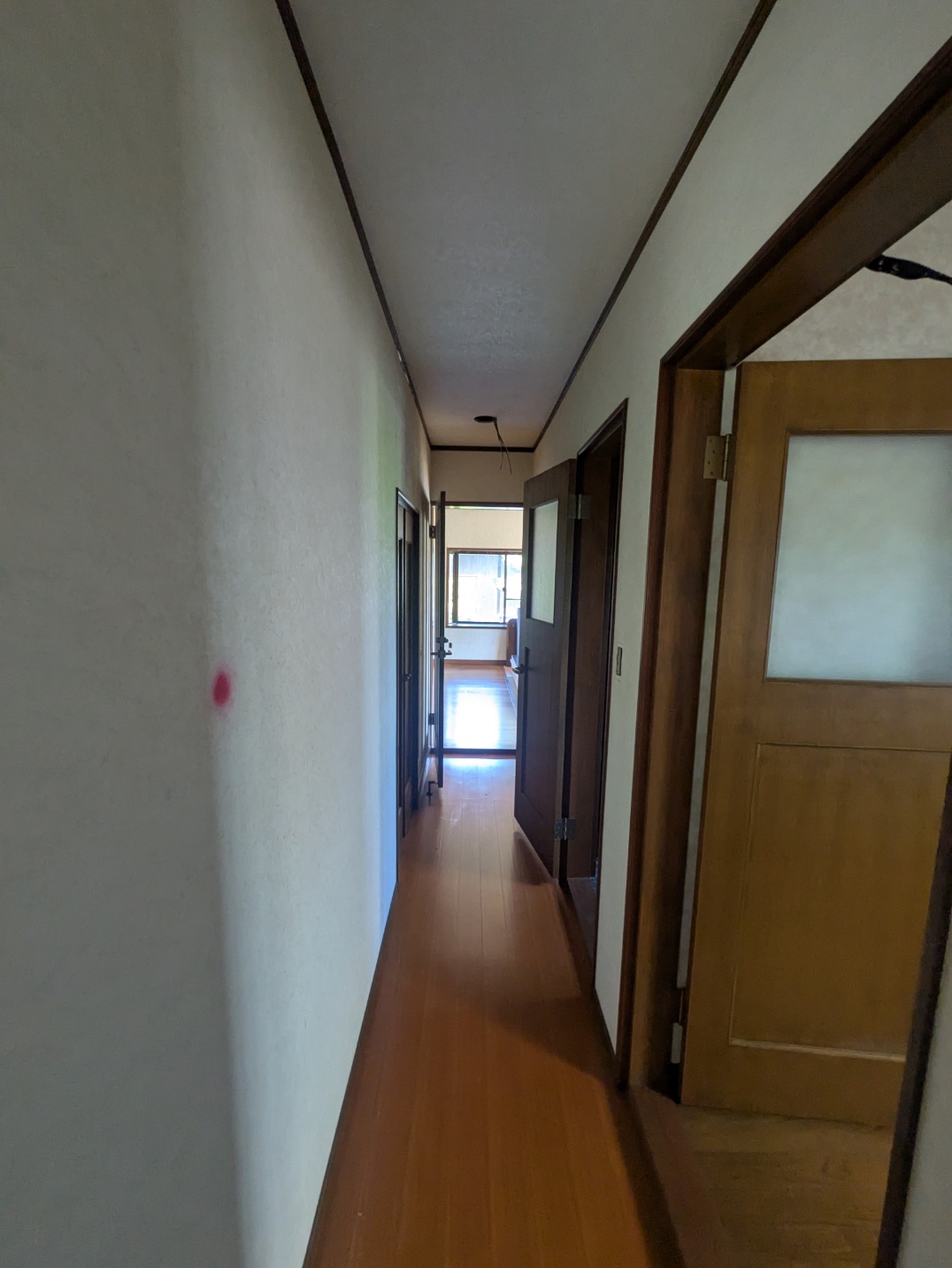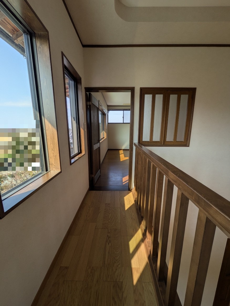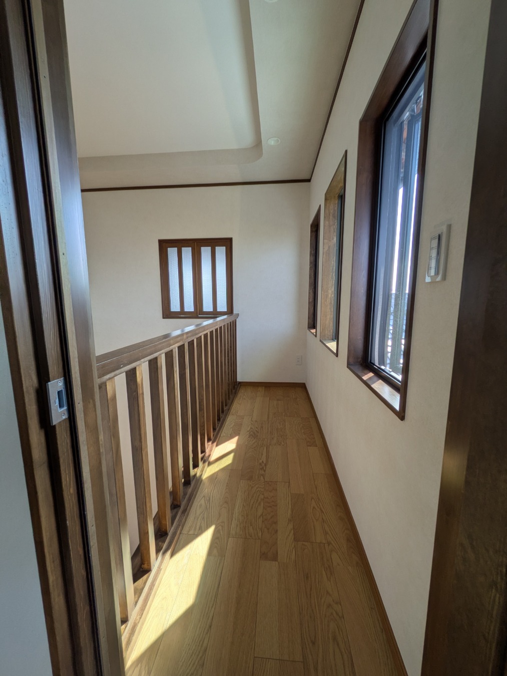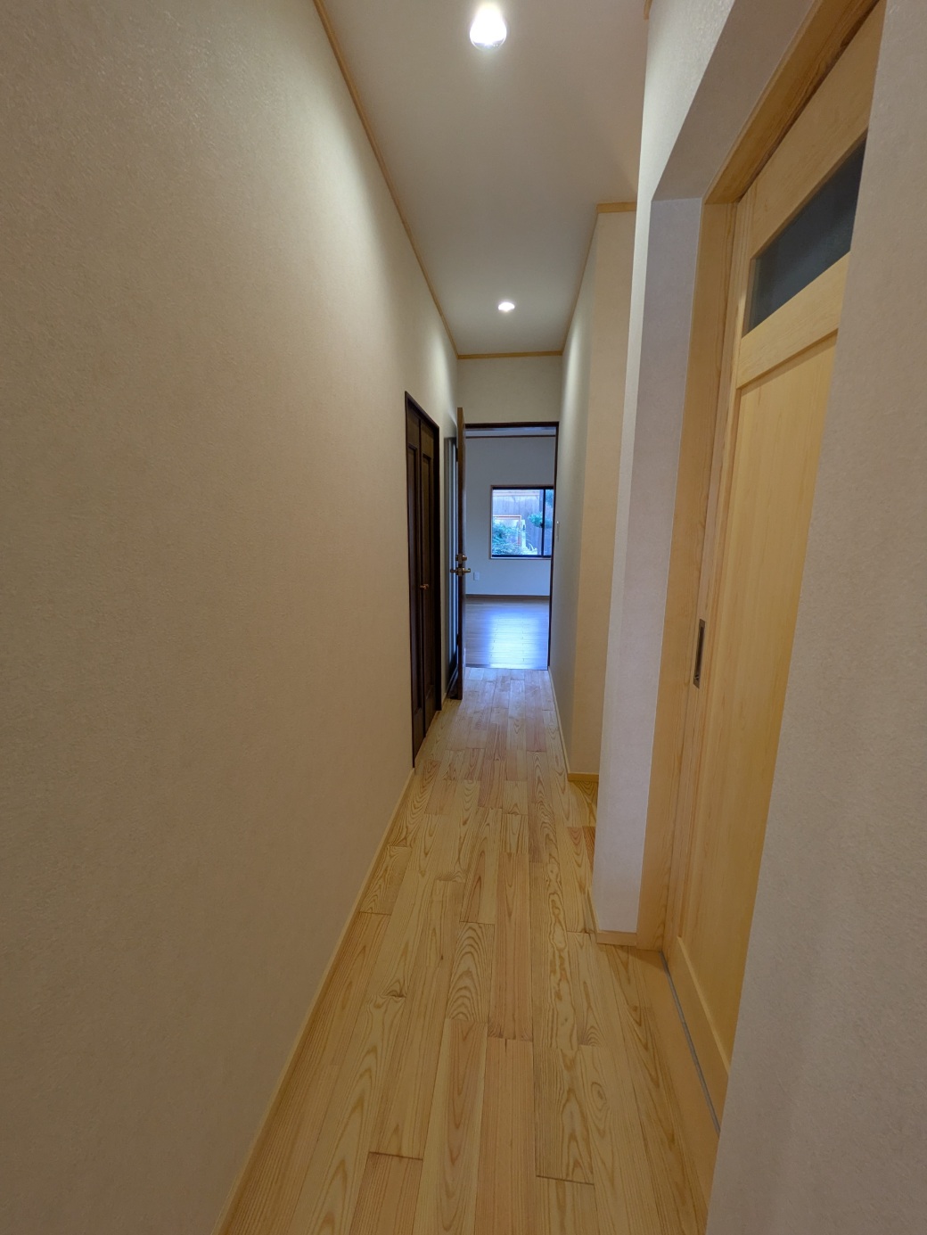 寝室へ行く廊下も松の無垢床で仕上げ明るい空間に仕上げました。