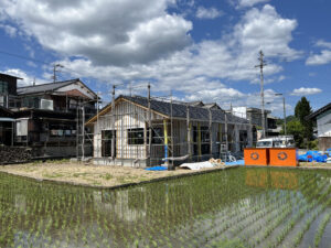 このお家は隣地が田で、ちょうど田植えの時期で水が張っており、