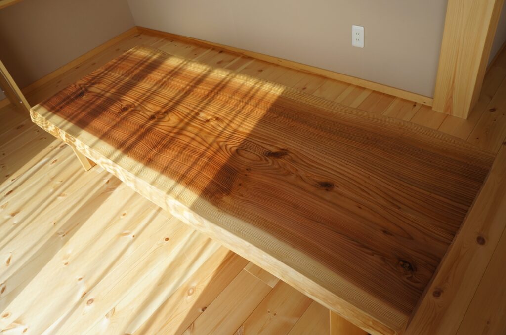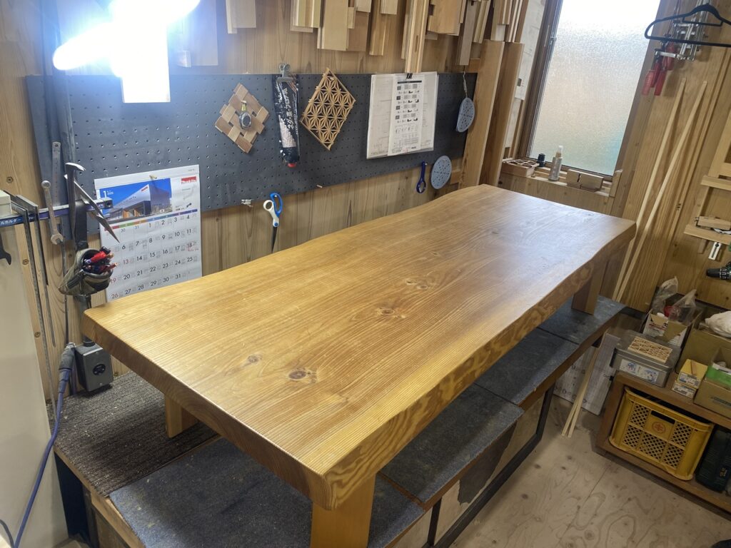 大きく分厚い杉の一枚板から食卓と和室用の座卓のふたつを製作しました。