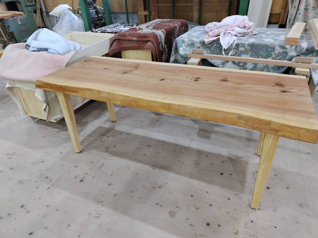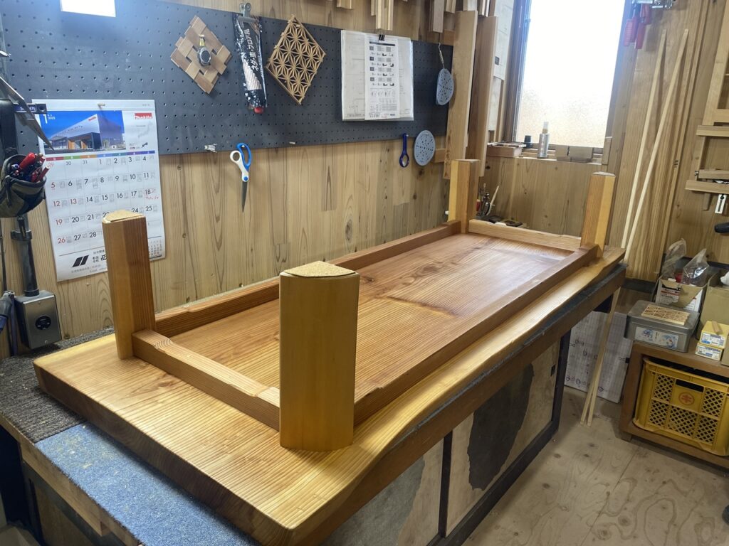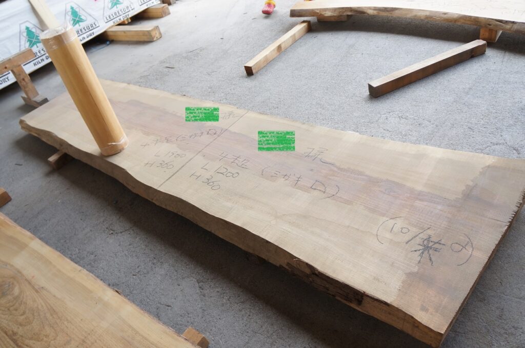 今回はこちらの食卓の方のみをお預かりし、新日本建設の加工場(ウッドファクトリー)にて製作部の押岡さんに作業してもらいました。