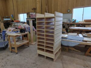 このような造り付けの棚なども仕上げ工事前に取り付けしていきます。