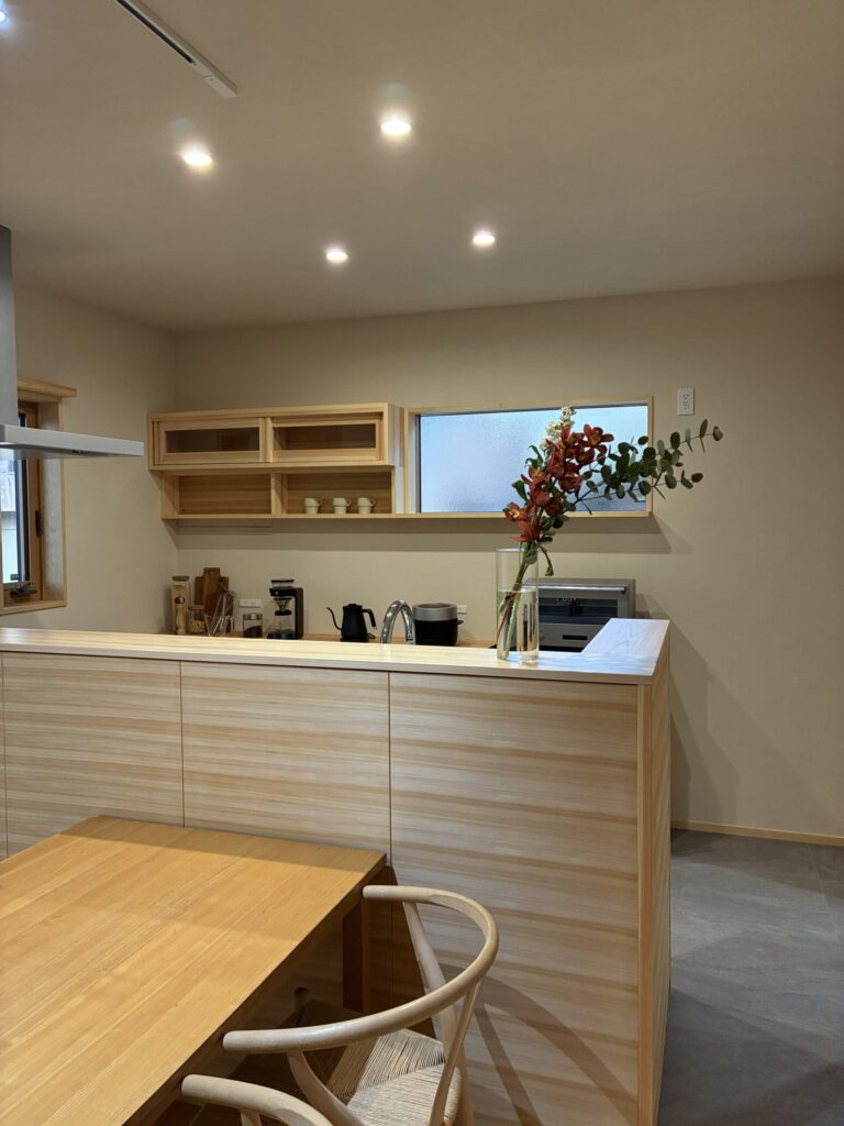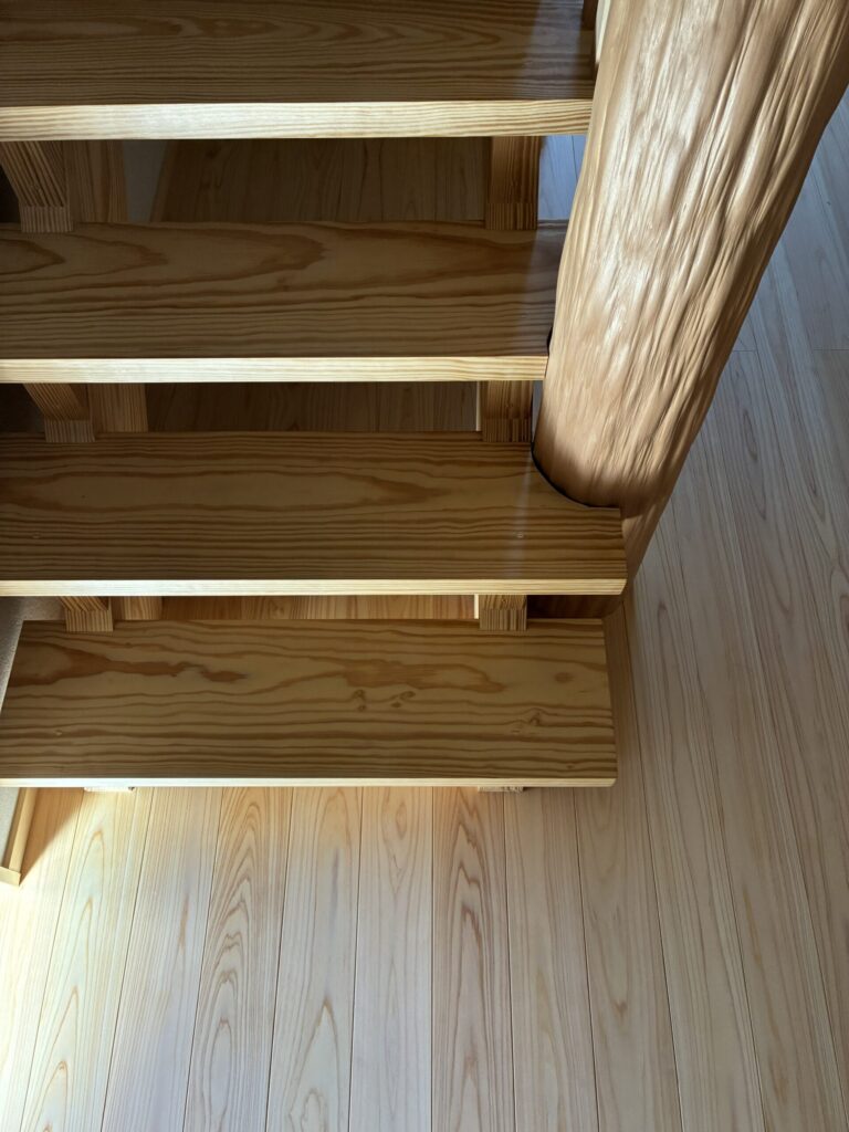 無垢の木を使ったキッチンや磨き丸太など、色々な木の使い方が見られるナチュラルな空間でした。