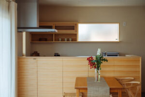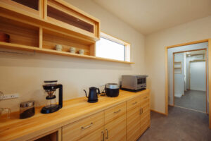 背面収納やキッチン前の壁も造作でさせて頂いたのですが、