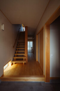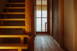 玄関を入ると、スケルトンの造作階段とスギの絞り丸太があります。
