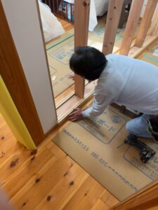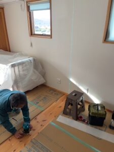 大工さんが床に機械を据えて、ピッと光るラインに合わせて印をつけていきます。このまっすぐが、仕上がりの美しさを左右する大切な工程です。