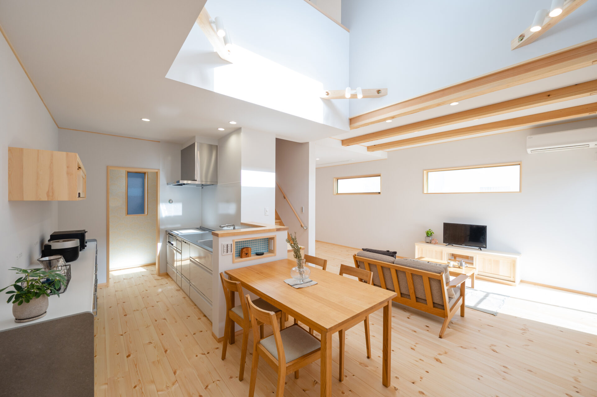 吹き抜けリビングのある、収納力抜群の家。デザイン性と実用性を兼ねそろえたナチュラルモダンなお家が完成しました。