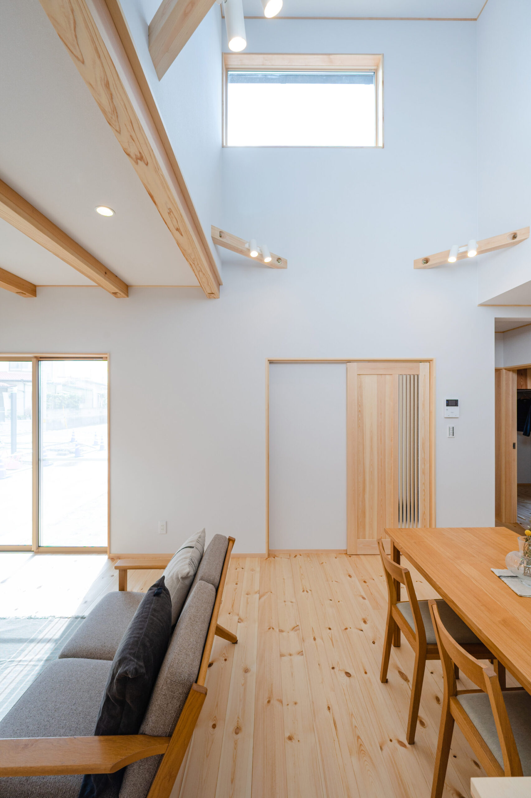 吹き抜けには、光を取り入れるための大きなFIX窓。これによりLDK全体に光が届きます。