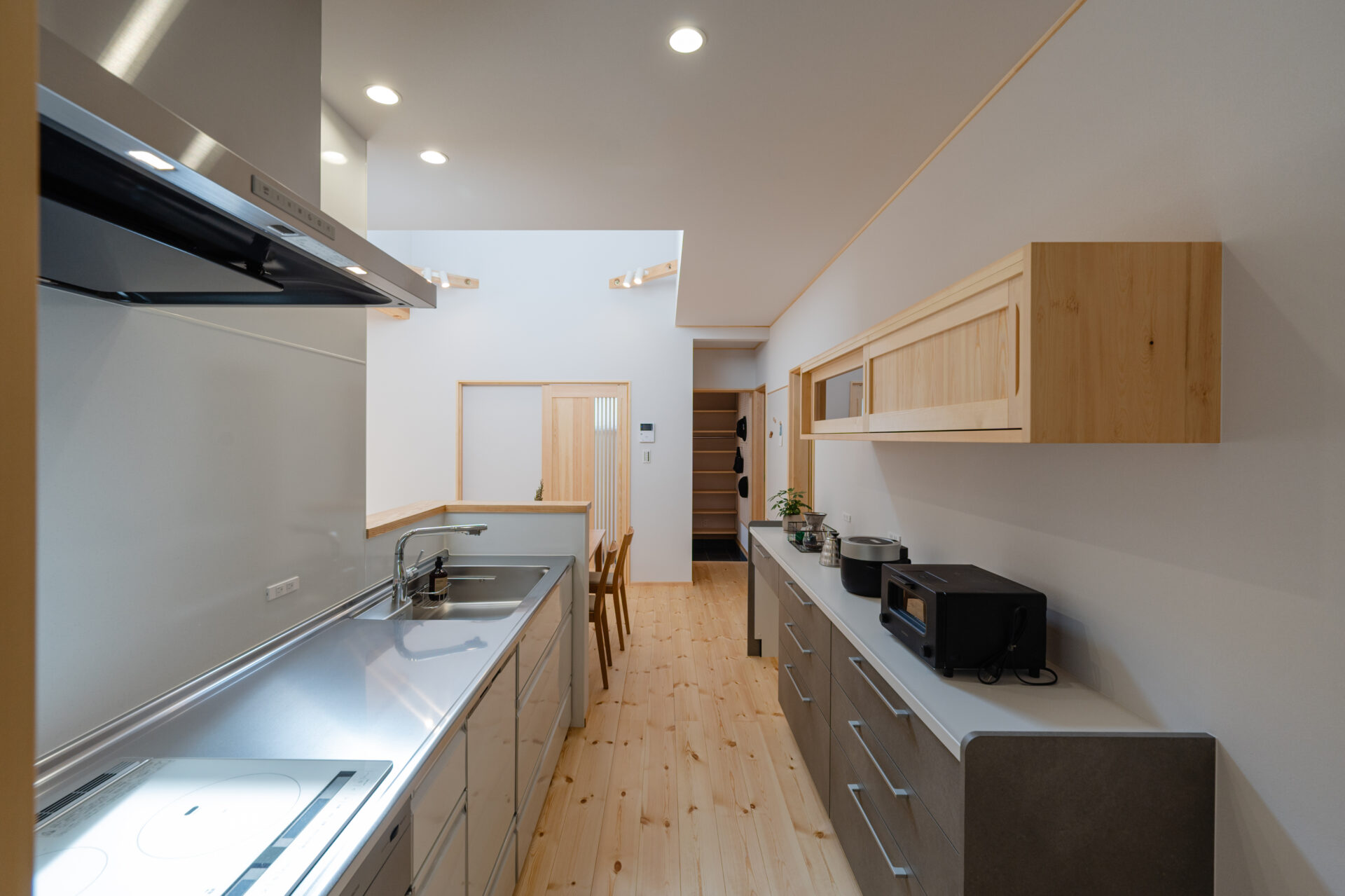 家族用玄関からの導線を考えたキッチンスペース。背面収納は実用性を考え、既製品と造作を組み合わせました。