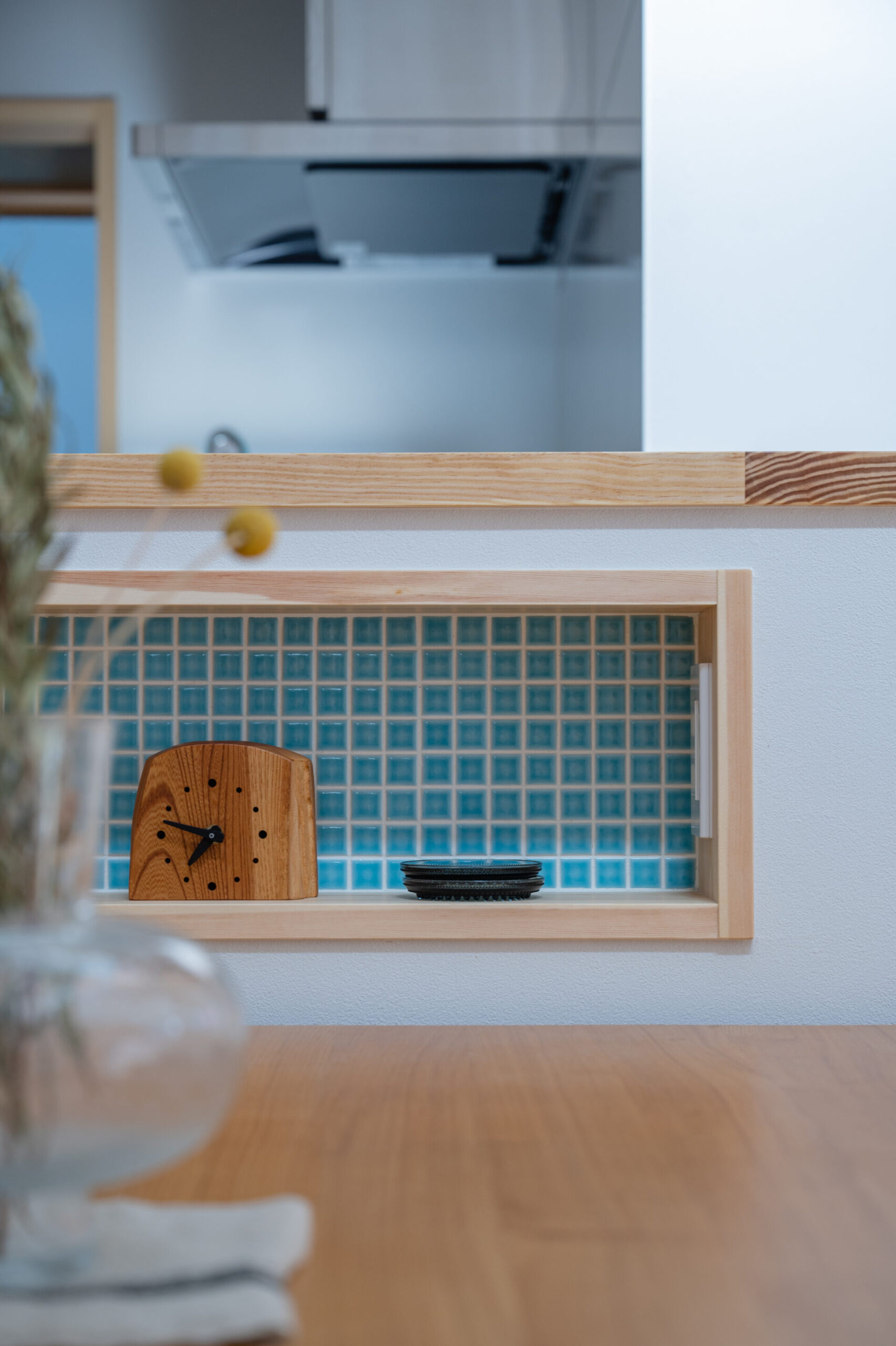 お気に入りのタイルを貼ったニッチは、デザイン性はもちろん、コンセントを配置したことで実用性もアップ。