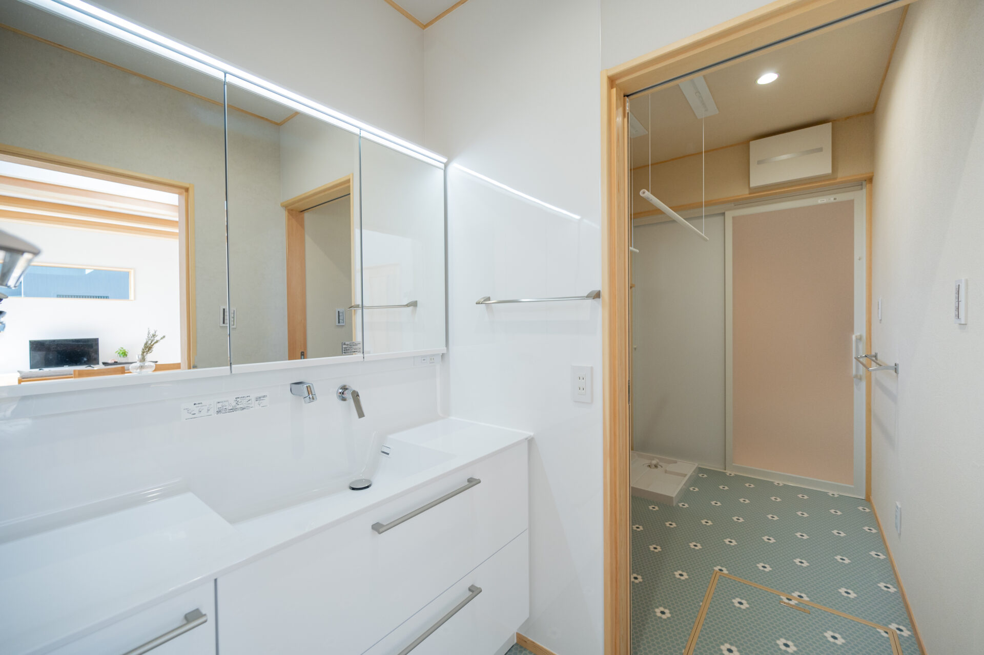 脱衣所にはアイロン台も設置しており、ランドリースペースとしても利用できます。2スペースに使用されている床のデザインが目を引く空間。
