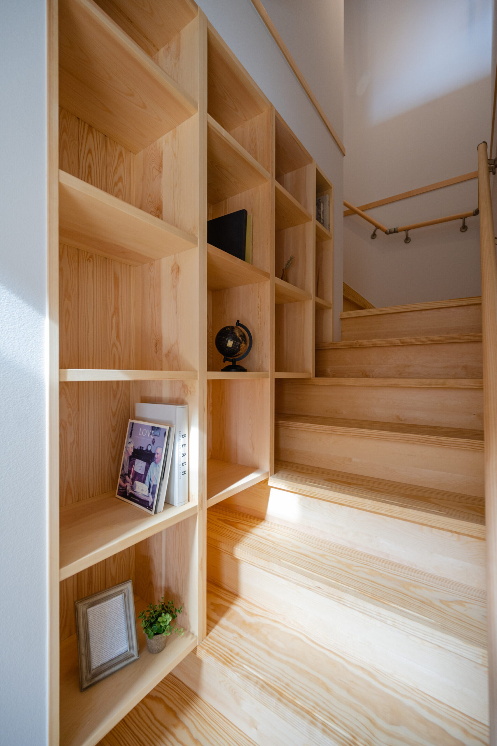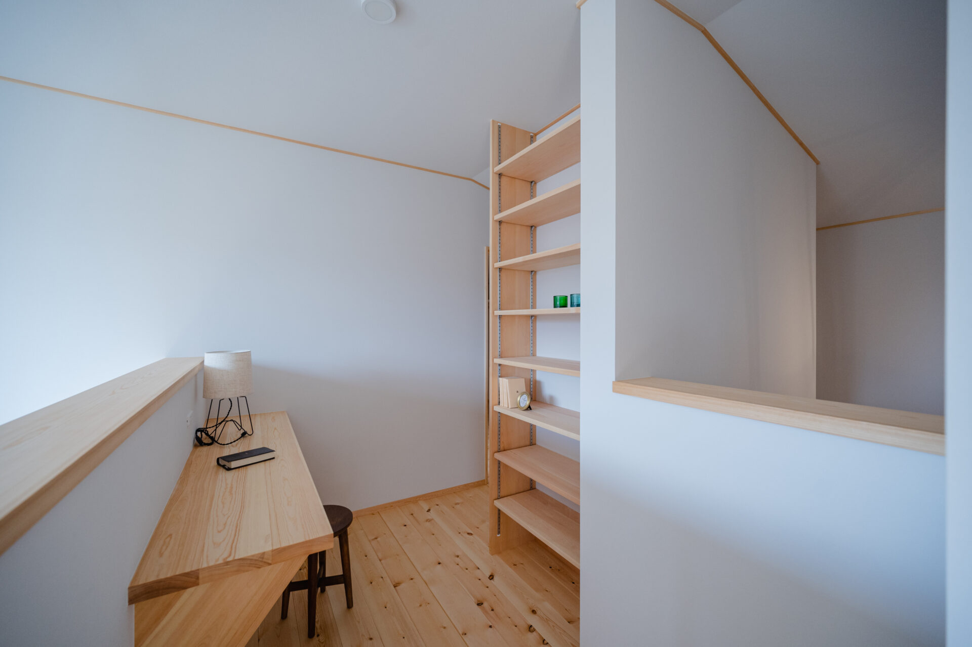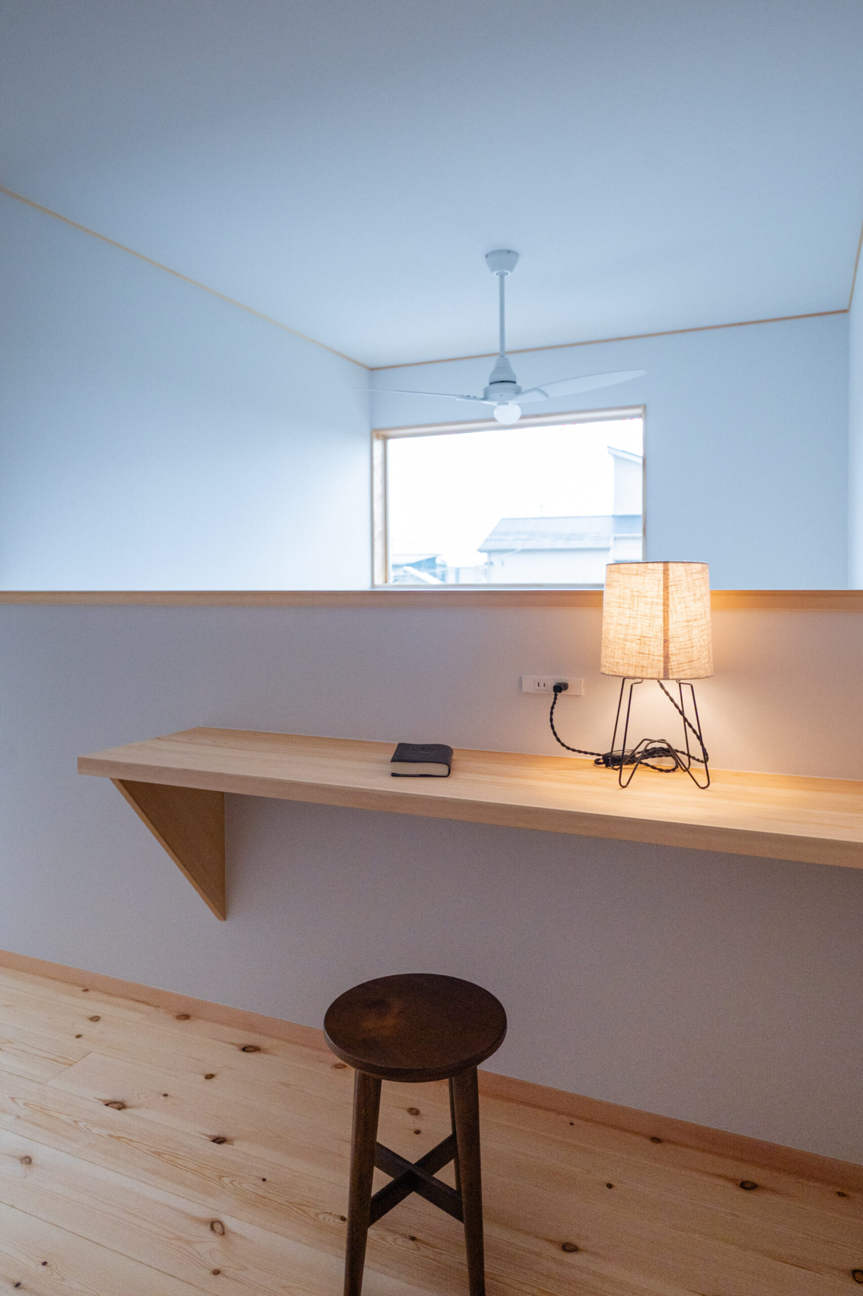 二階の廊下には、造作のカウンターと可動棚を設けた読書スペース。