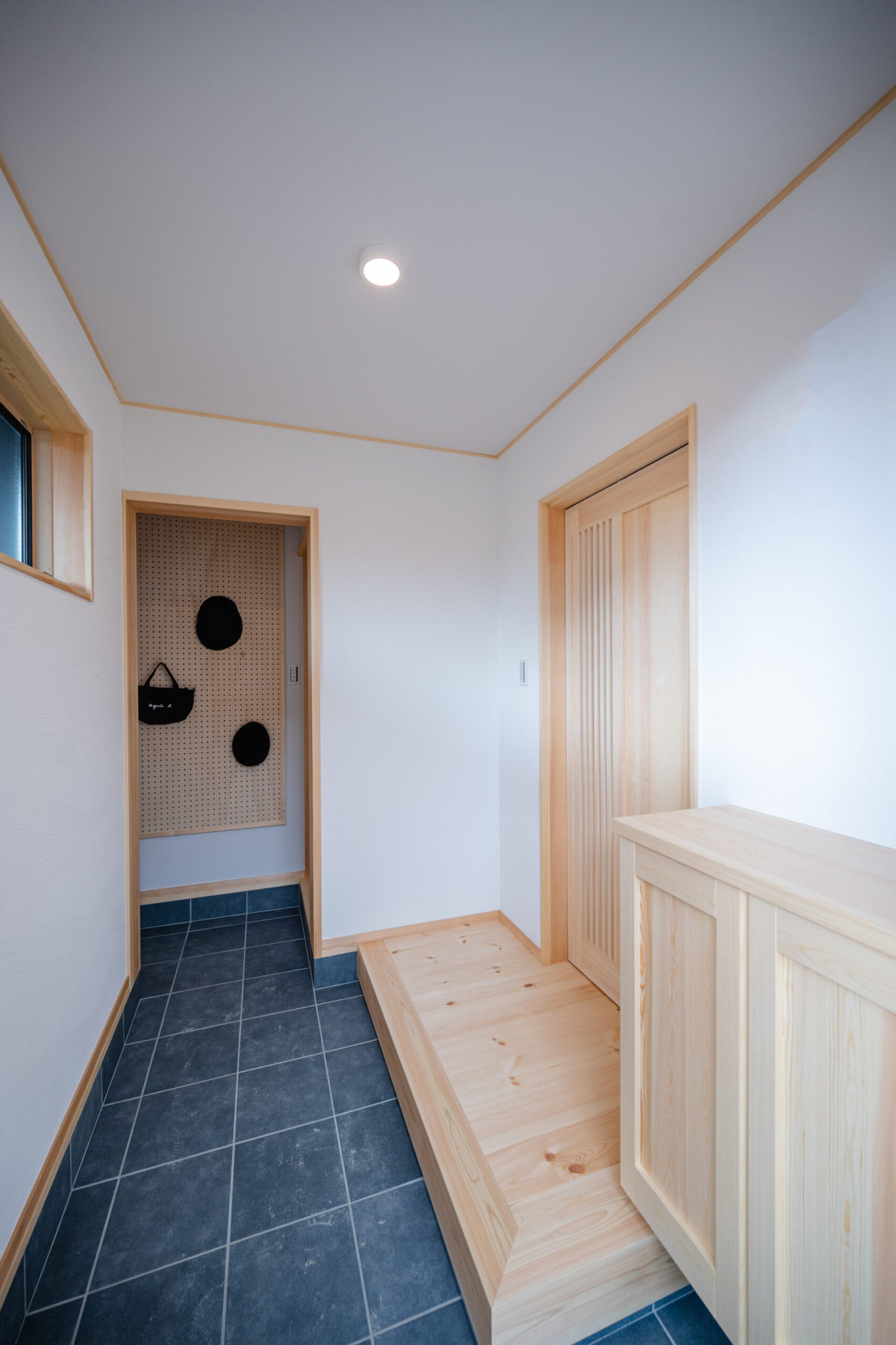 玄関には造作の靴箱、奥には有効ボード。お子様の持ち物をかけて収納できるようになりました。