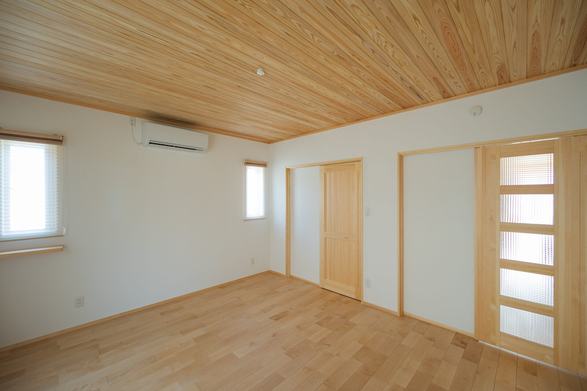 洋室は杉板張りの天井で、温もりある落ち着く空間となりました。左側のドアの奥にはWIC。