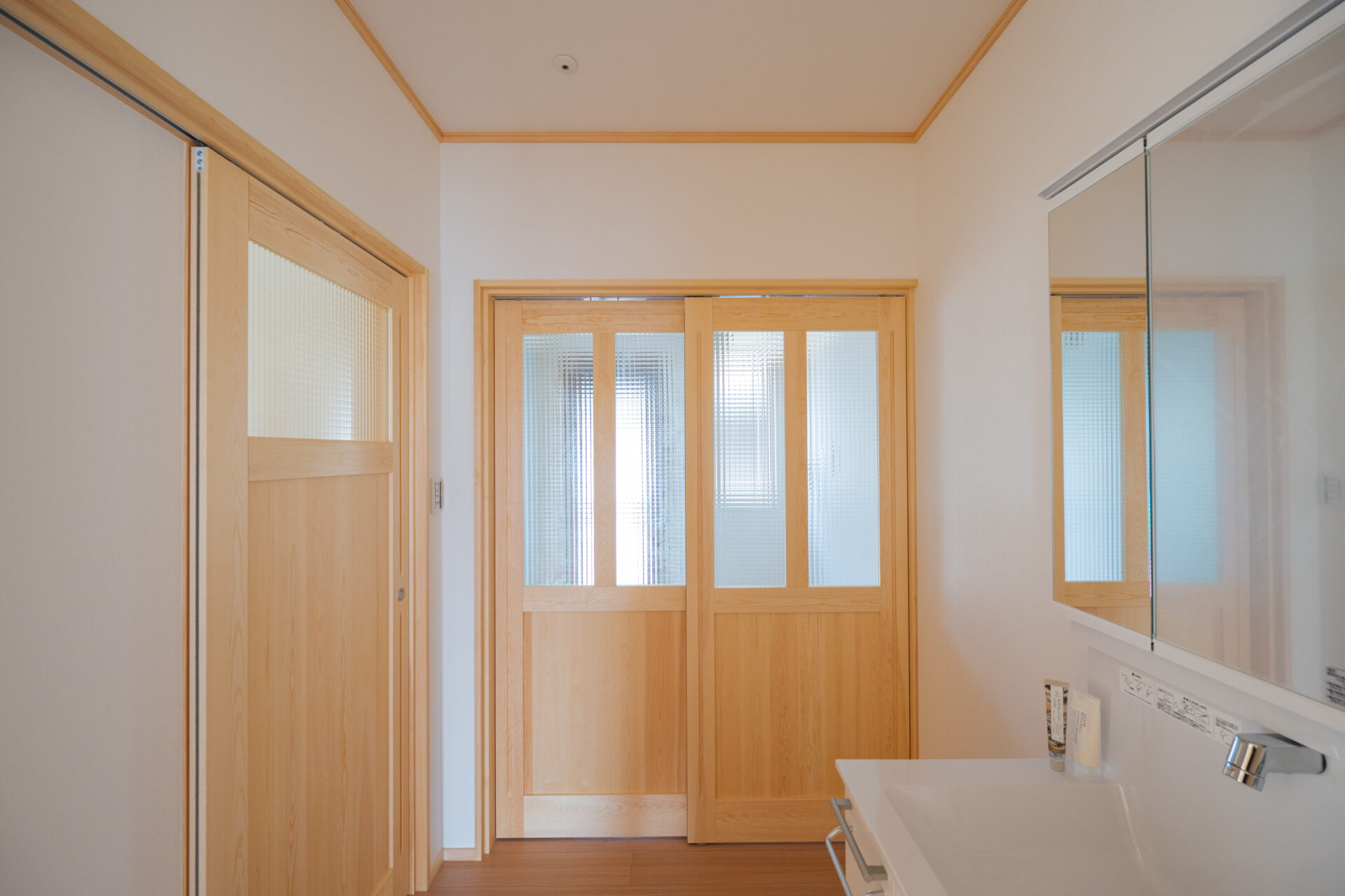 キッチンの奥には、建具が映える洗面・ランドリールーム。奥には脱衣所があり、水回りは一箇所にまとめています。