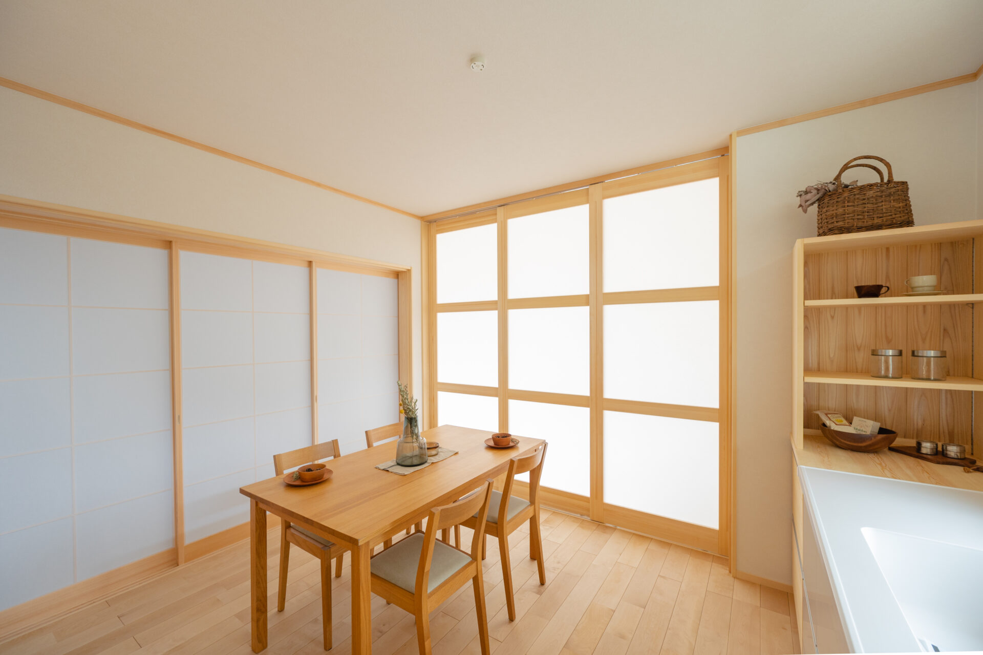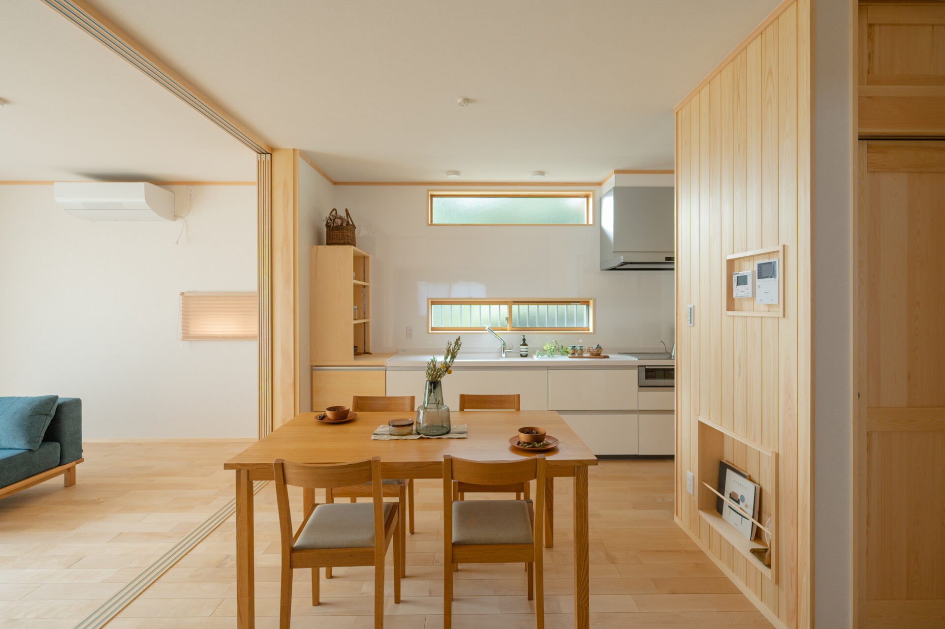 窓はプライバシー面と斜光を考えて、二つの横長の窓を採用しました。ダイニングテーブルの横の壁は板張りにして、ニッチを付けることでデザイン性のある空間に。