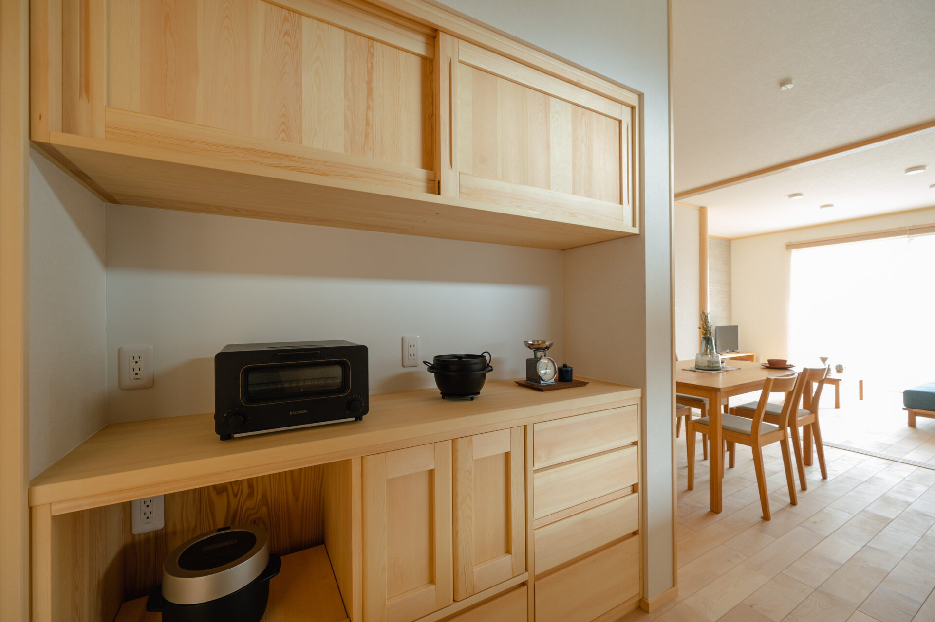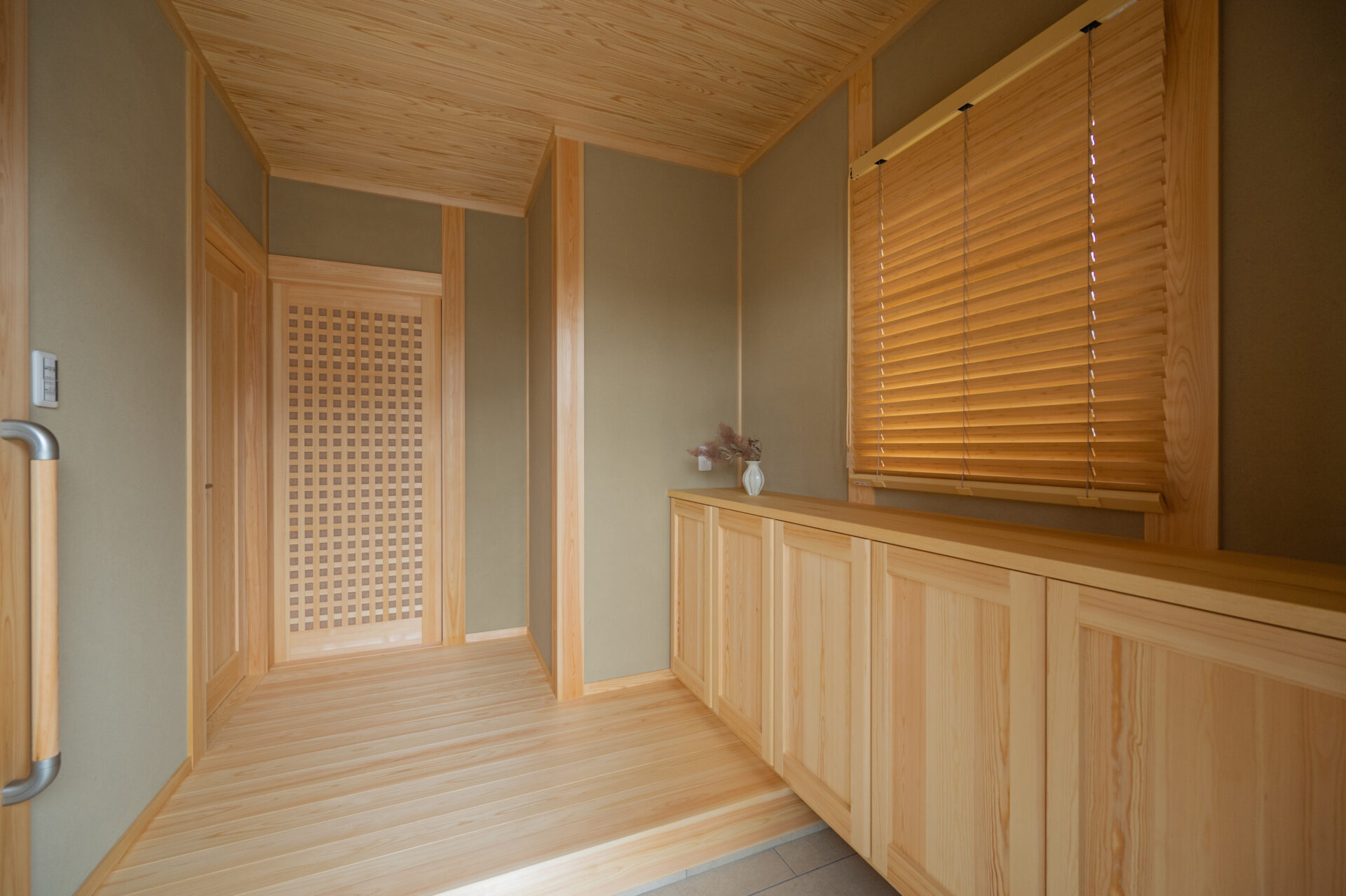 玄関には、左官仕上げの壁材「じゅらく壁」を使用したため、和の趣を感じられる空間に。土壁の一種のため、湿気を吸ったり吐いたりして室内の湿度を調整する性質もあります。
