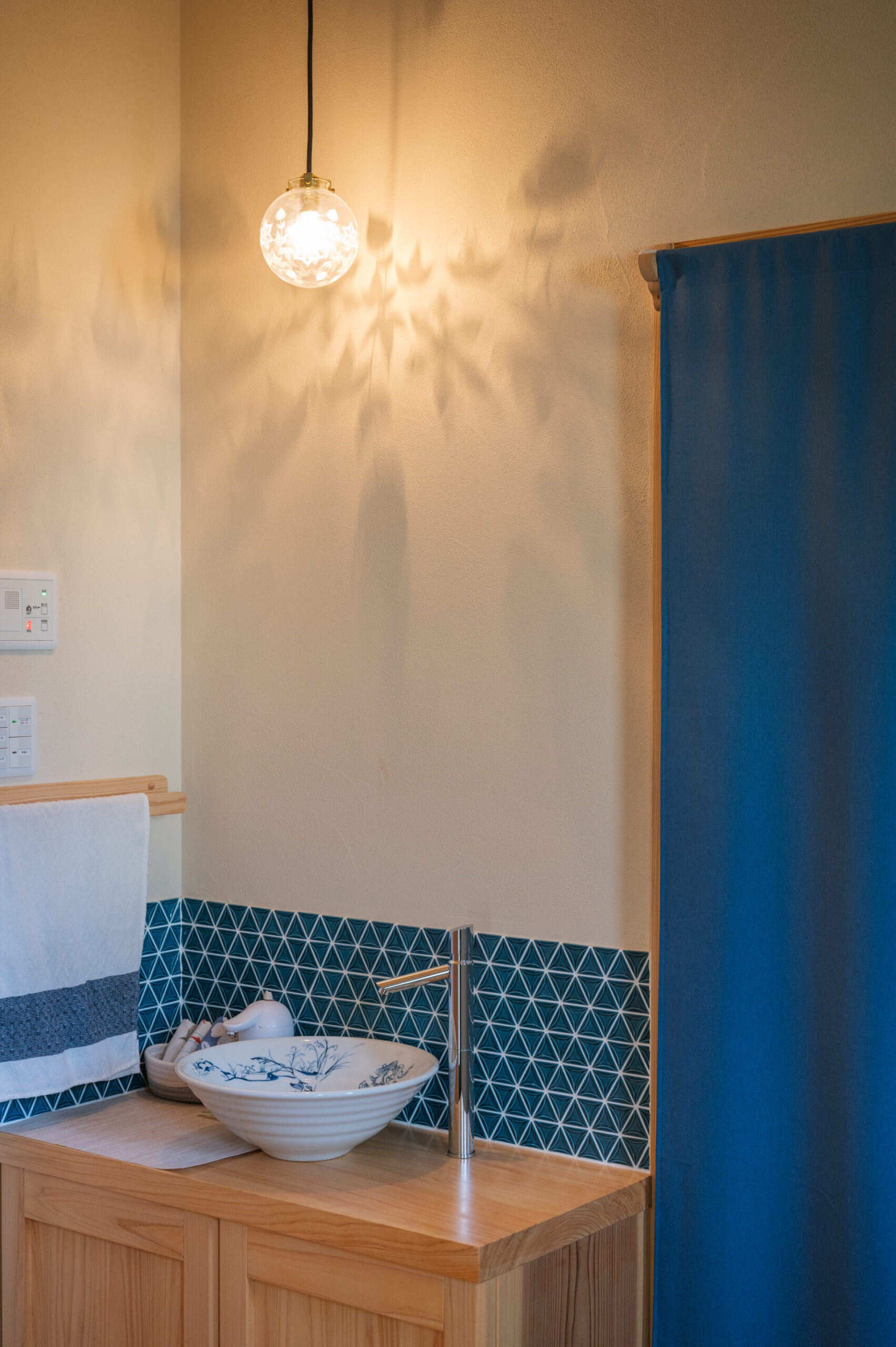 帰宅したらすぐに手が洗える手洗い場。洗面ボウルの絵やタイルの色合い、照明までこだわったお気に入りの場所です。