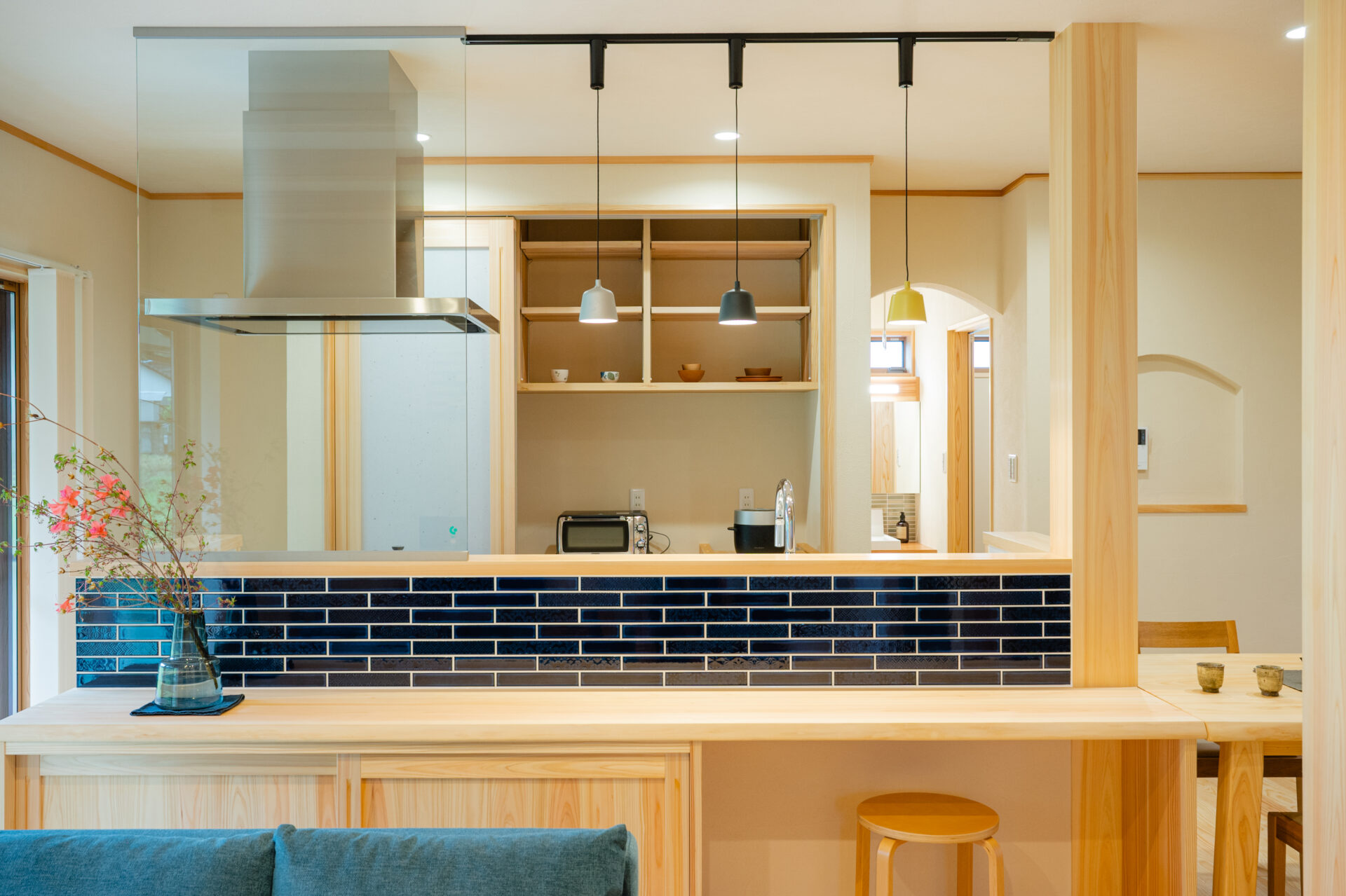 造作の一枚板のカウンターや背面収納、照明やタイルによって「和×洋」な空間となりました。