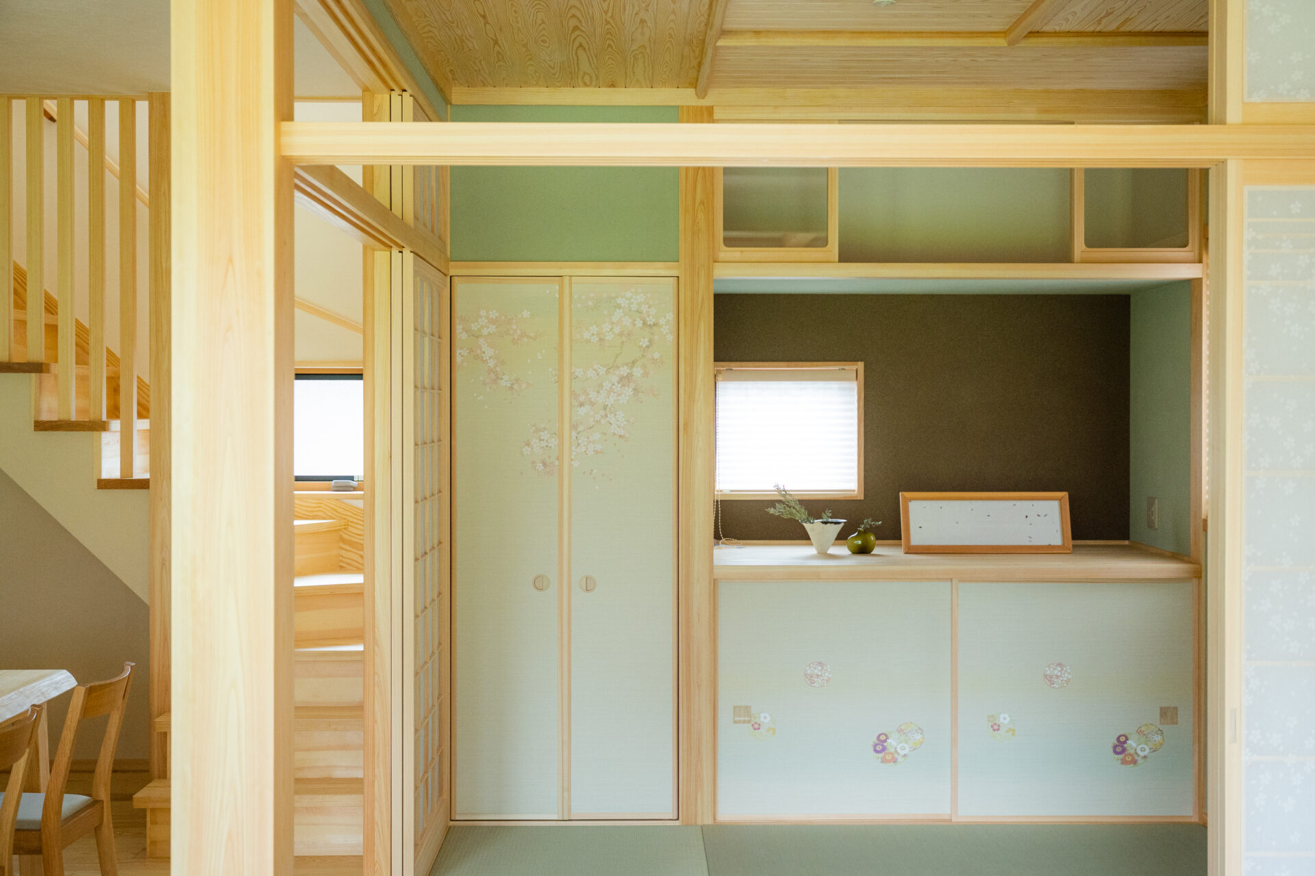 和室の神棚や飾り棚は寸法に合わせて造作し、使い勝手のよさを叶えました。リビングに和室を隣接させたことで、リビングがより広く感じます。