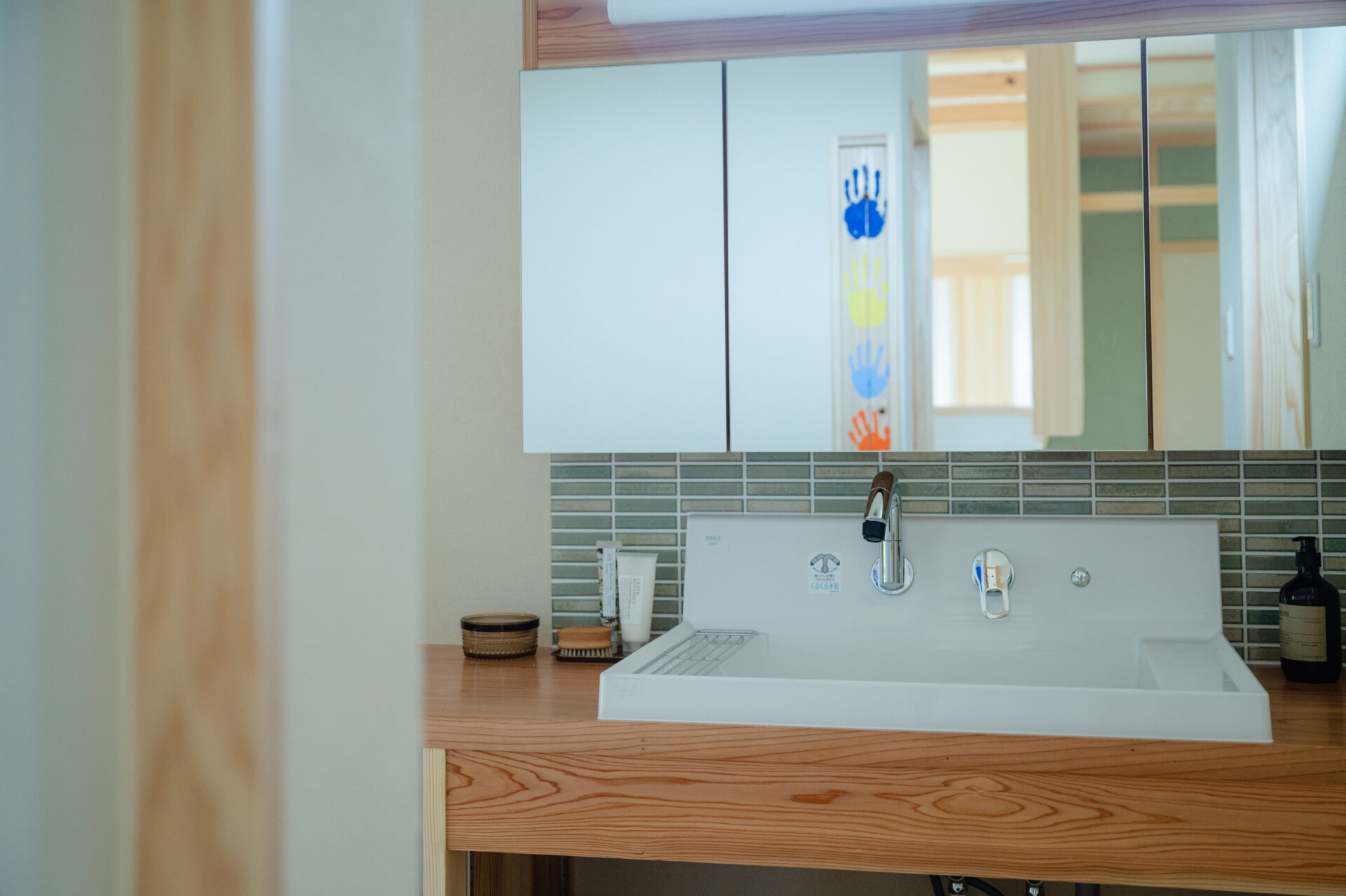 キッチンの奥にはナチュラルテイストの造作洗面台。その背面の壁には家族の手形を付け、オリジナルな空間となりました。