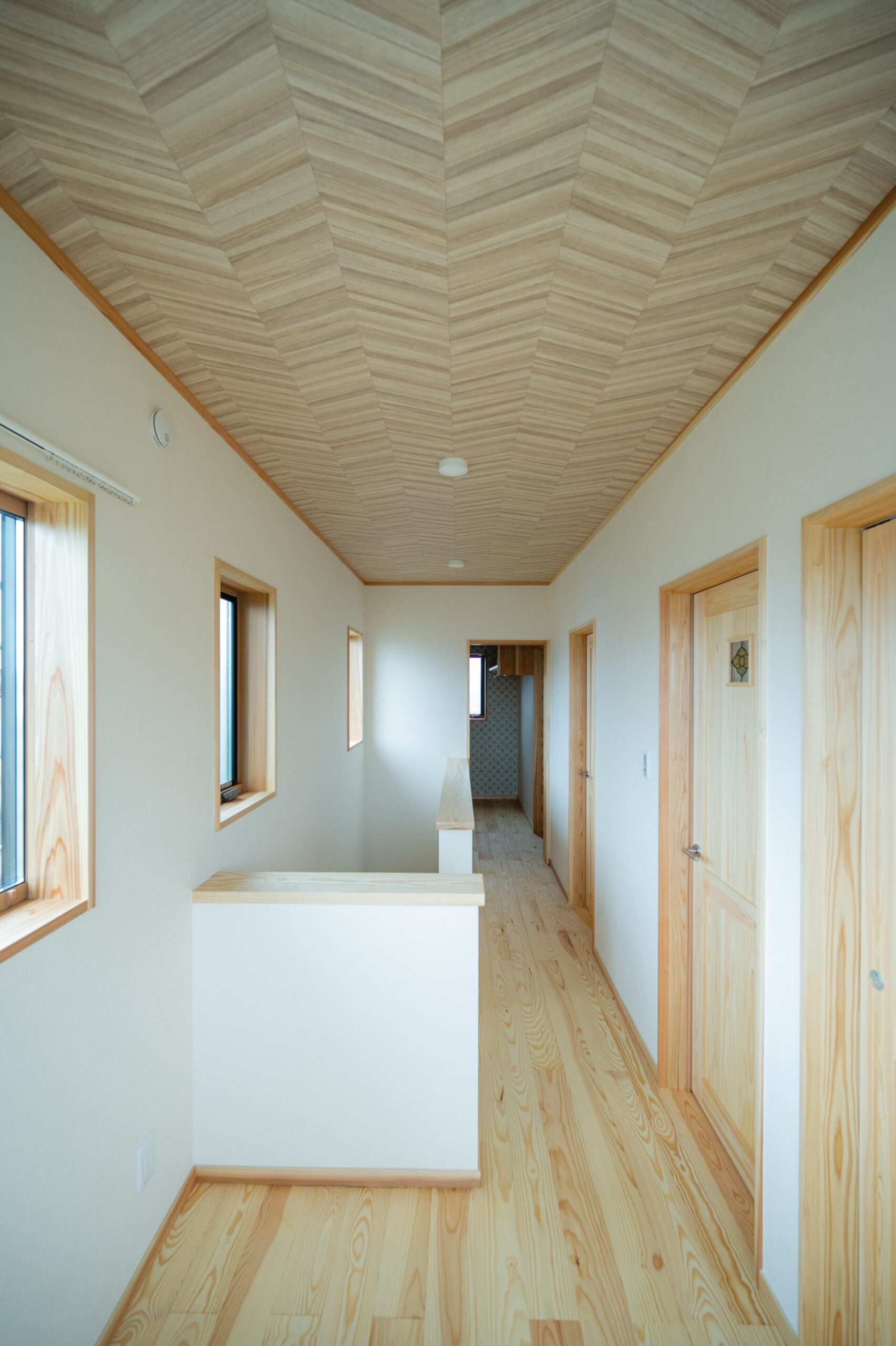 二階には3部屋の洋室とWIC。天井のヘリンボーンのクロスがアクセントの廊下です。