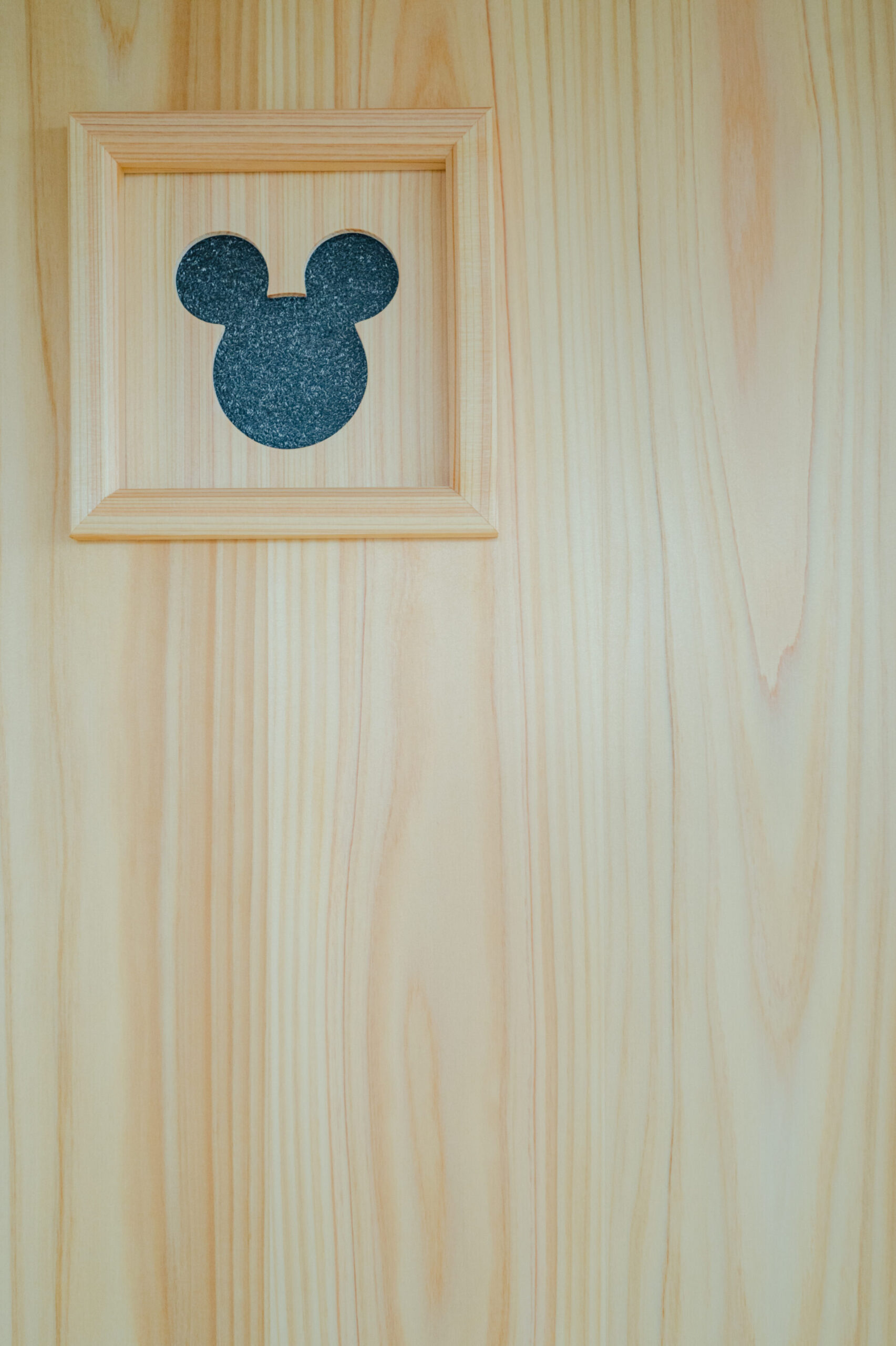 造作建具にはミッキーの形の窓を。実はダイニングテーブルにも隠れミッキーがいます。造作だからこそ叶う、遊び心満載のオリジナル家具が完成します。