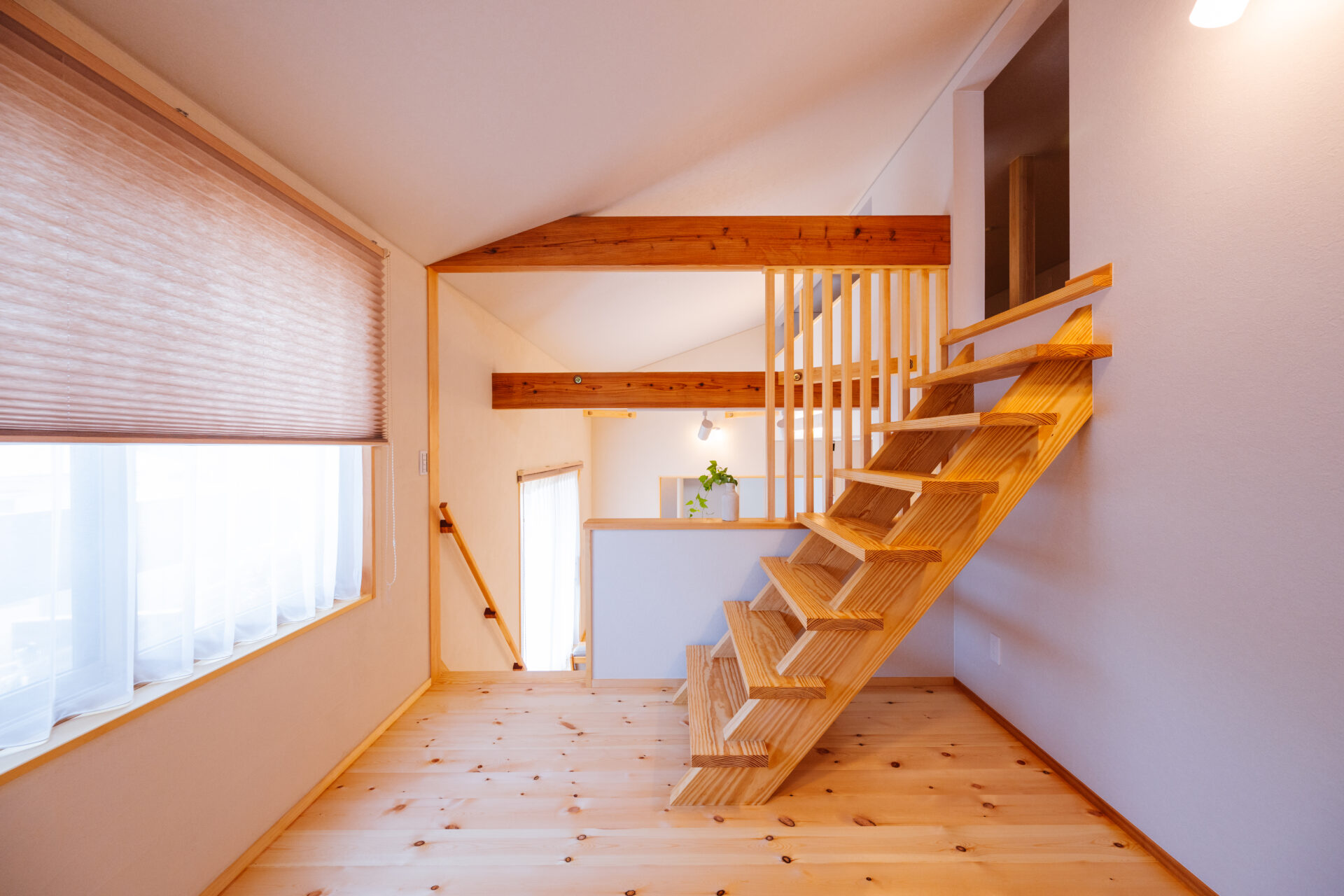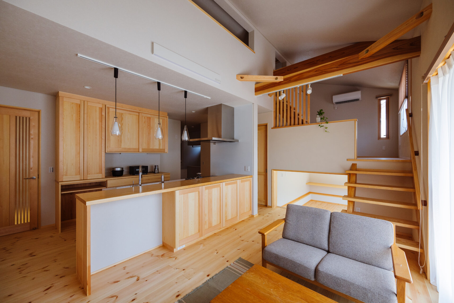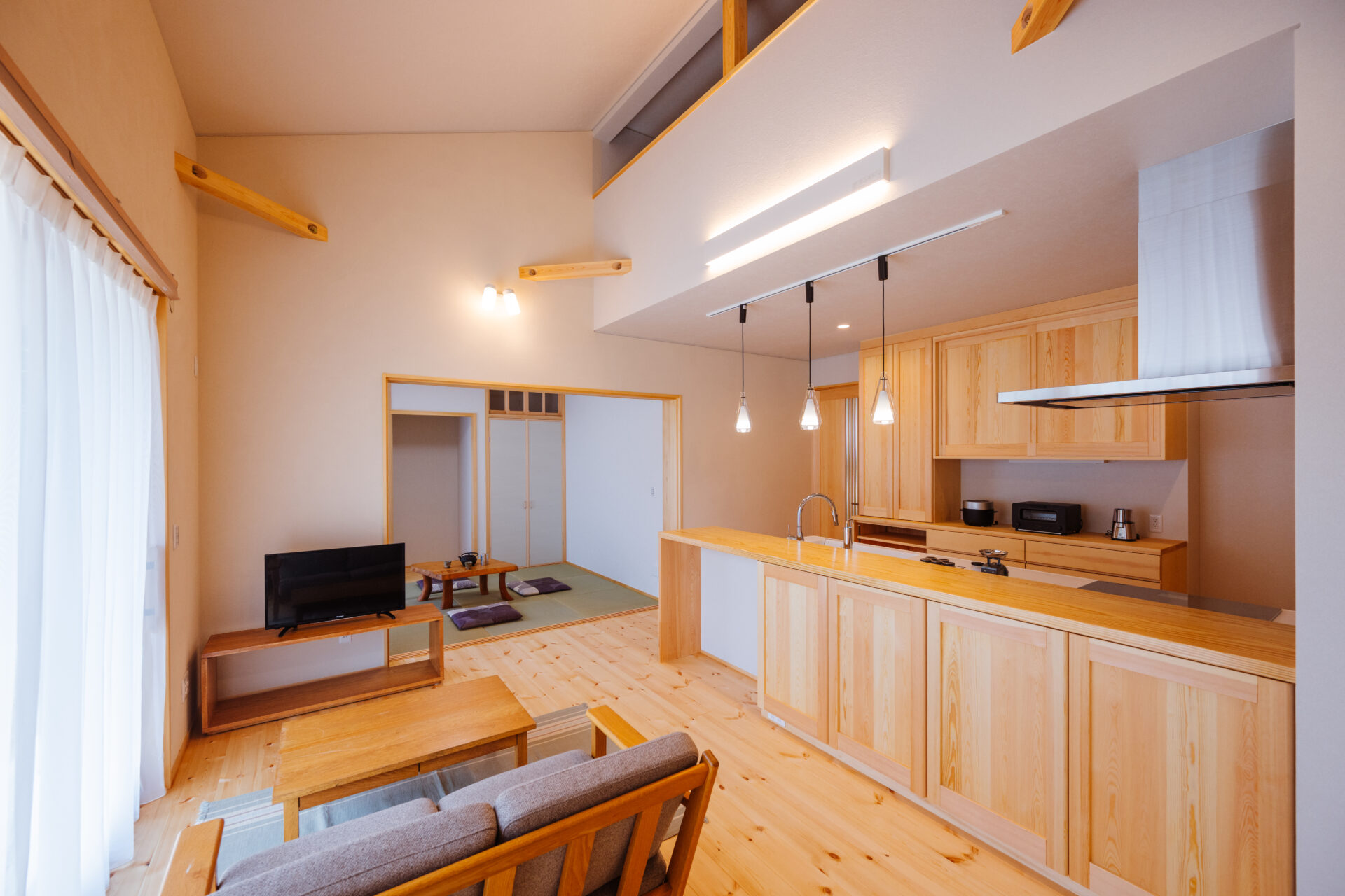 小屋裏収納を設けているため天井が高いのと、和室も隣接しているので開放感たっぷりの空間に。