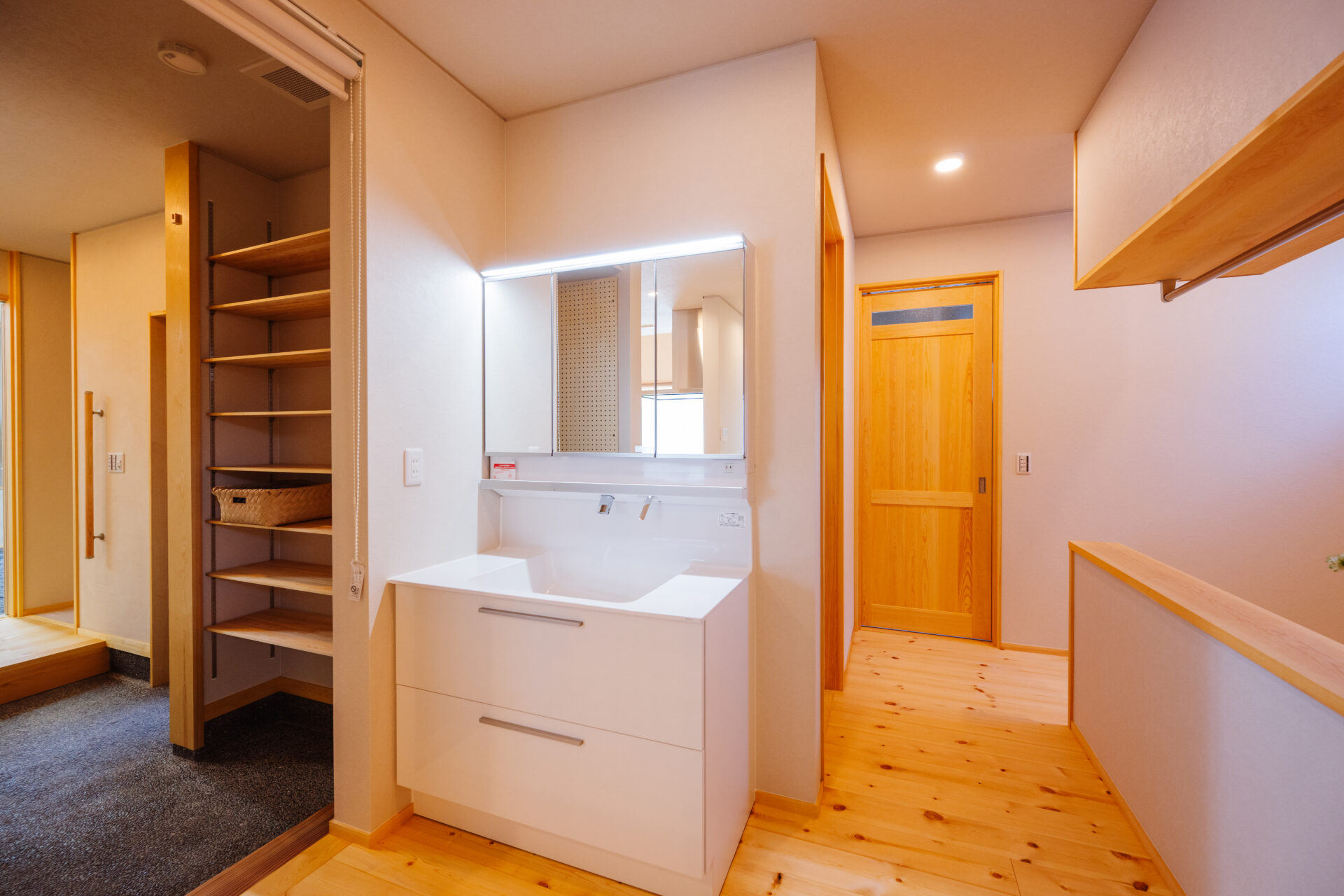 帰宅導線を考えた間取りで、家族用玄関のすぐ横には洗面台を設けています。