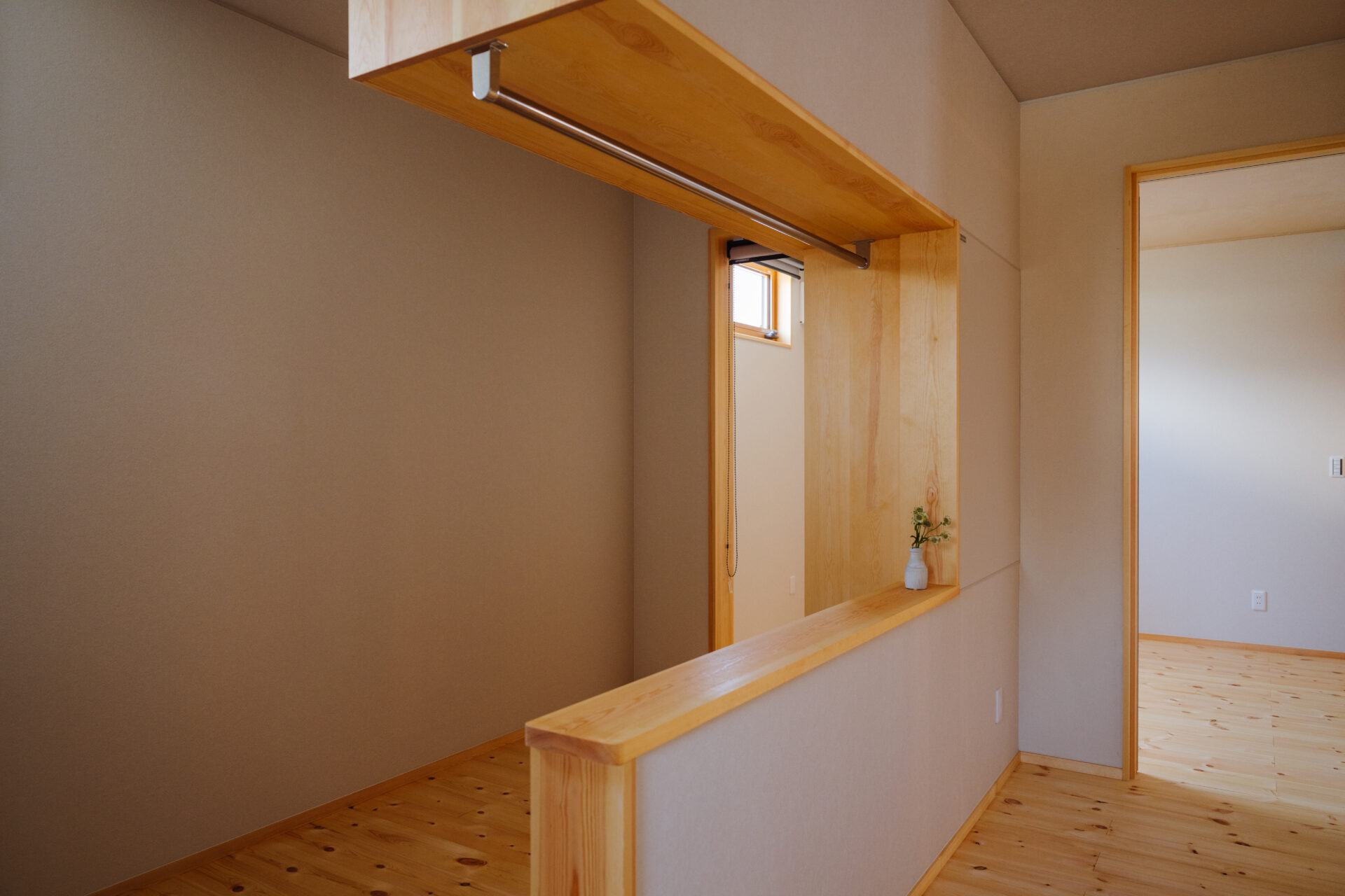 その横には、そのまま着替えることのできるスペース。一面壁にしなかったことで、圧迫感をなくし、通路のどちら側からでもハンガーにかけることができるようになりました。
