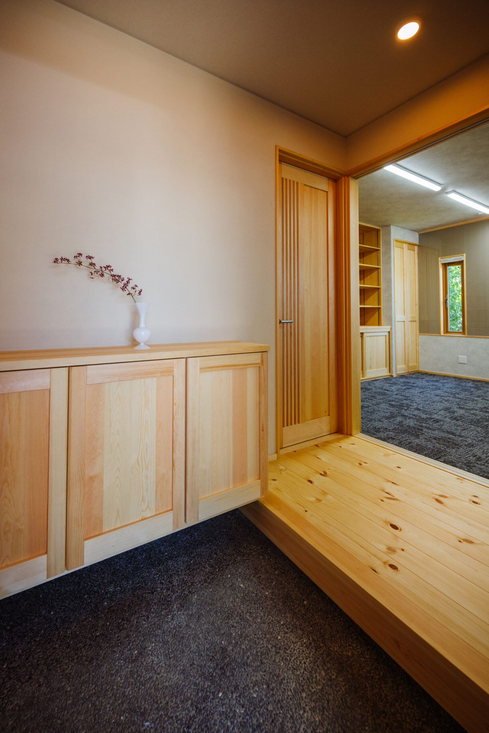 玄関の床には外から続く洗い出しを採用しました。玄関から見えるのはご自宅で行う習字教室用のお部屋。