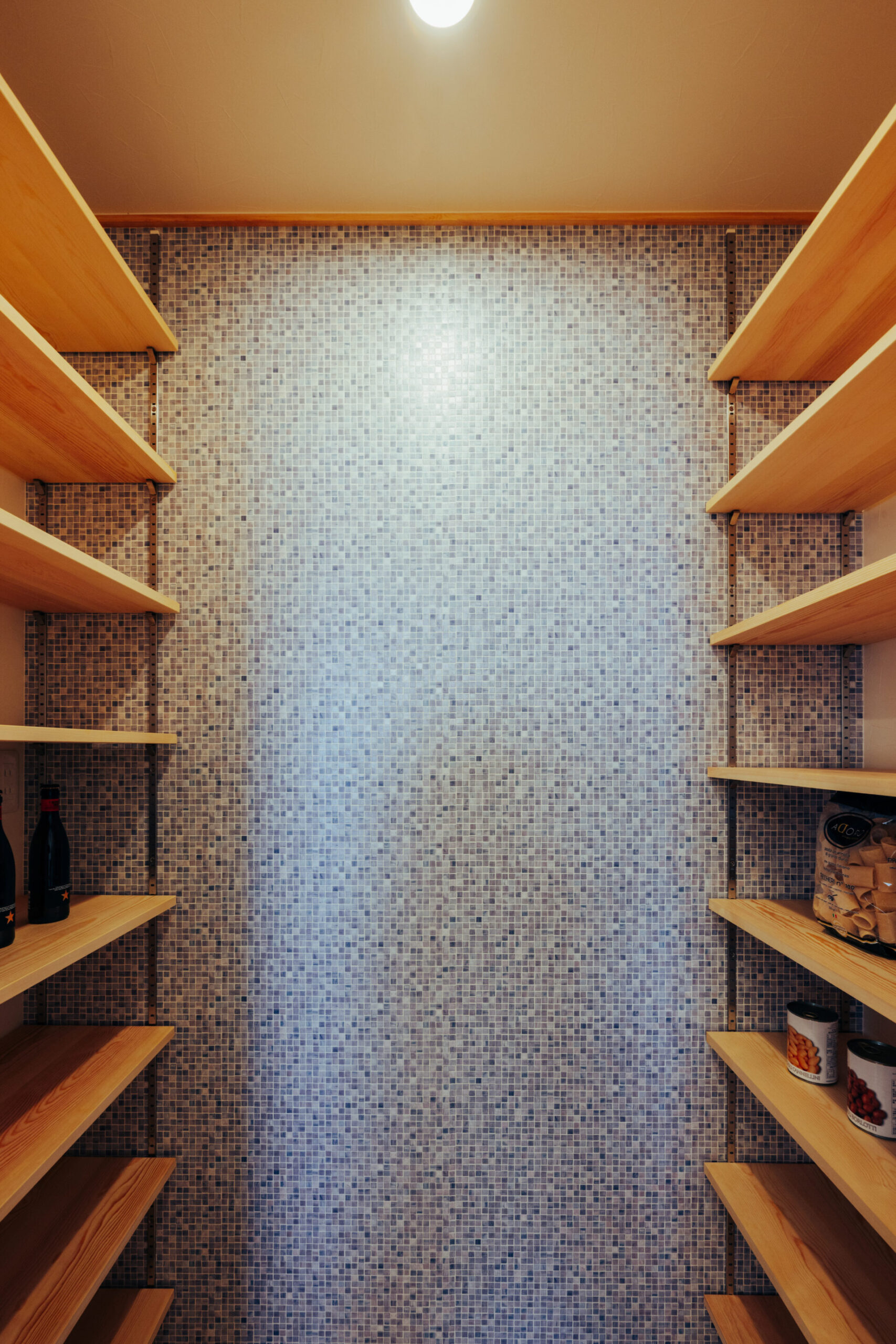 背面収納でも使用した、お気に入りのタイルを一面に貼ったパントリーも完備しました。