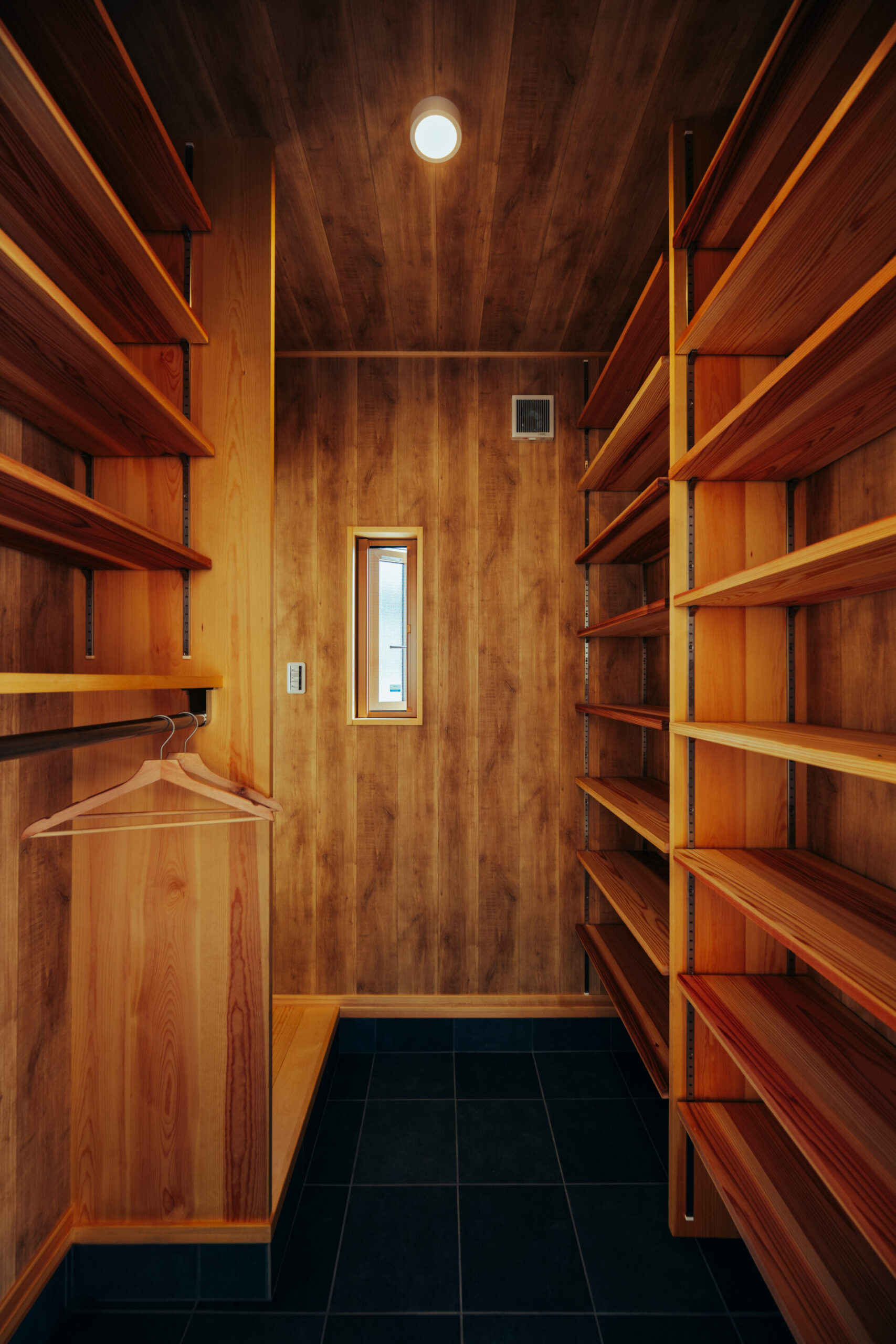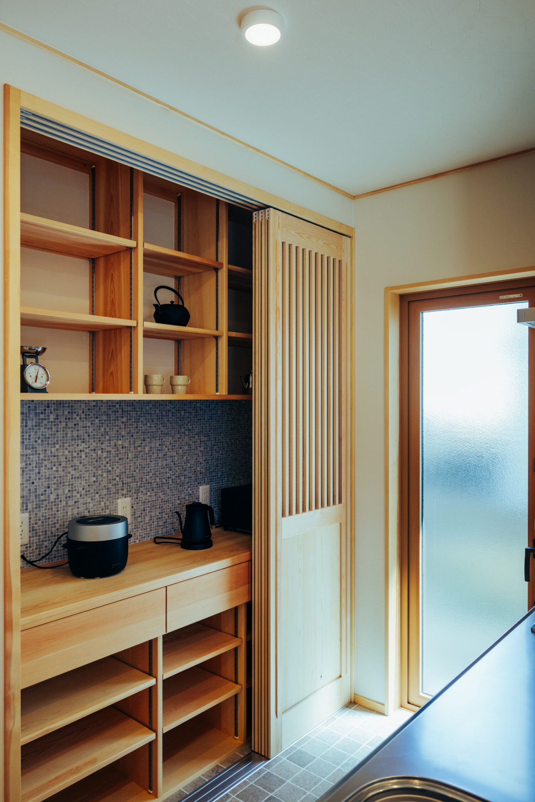 上手に隠しつつ、使い勝手の良い扉付きの背面収納。