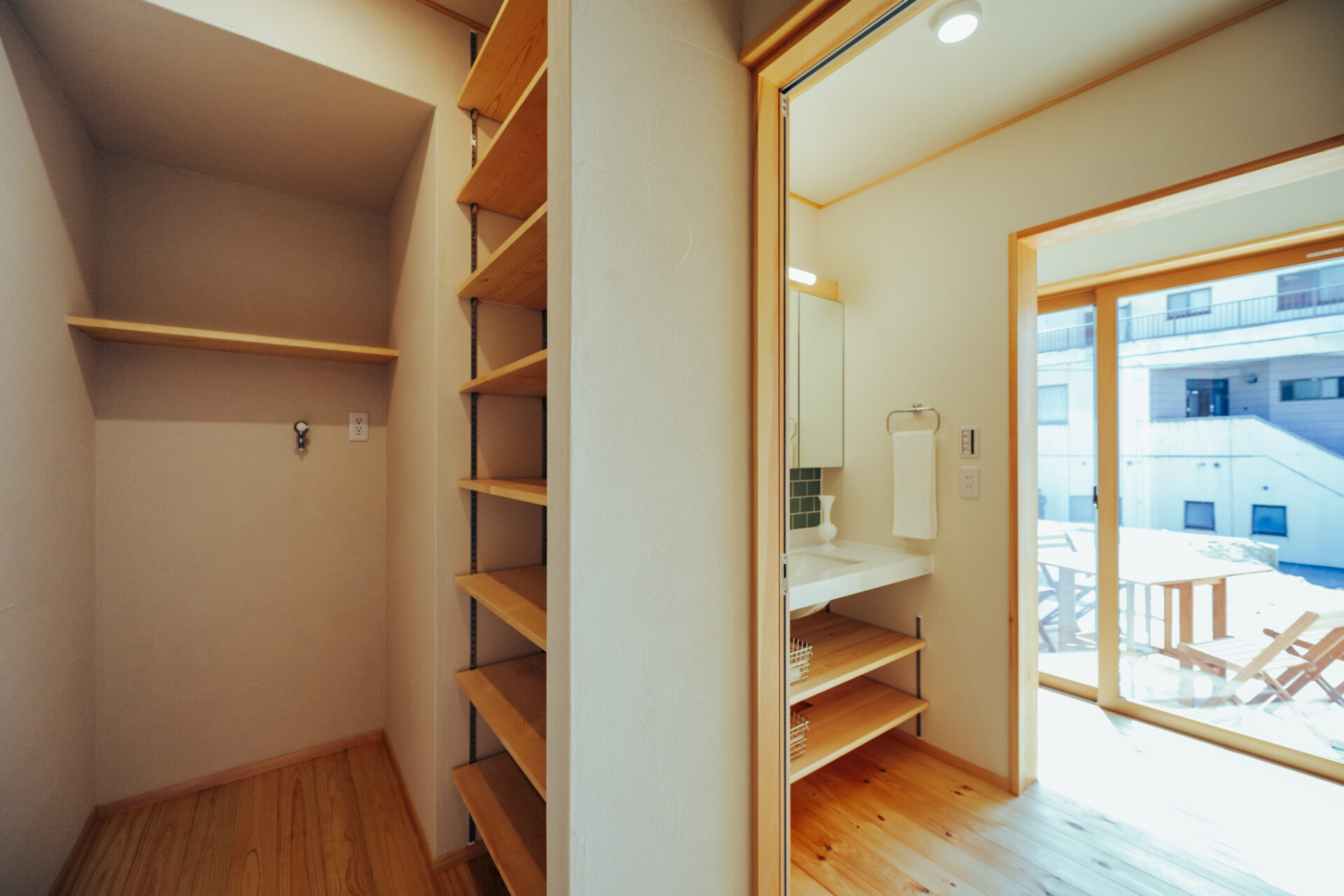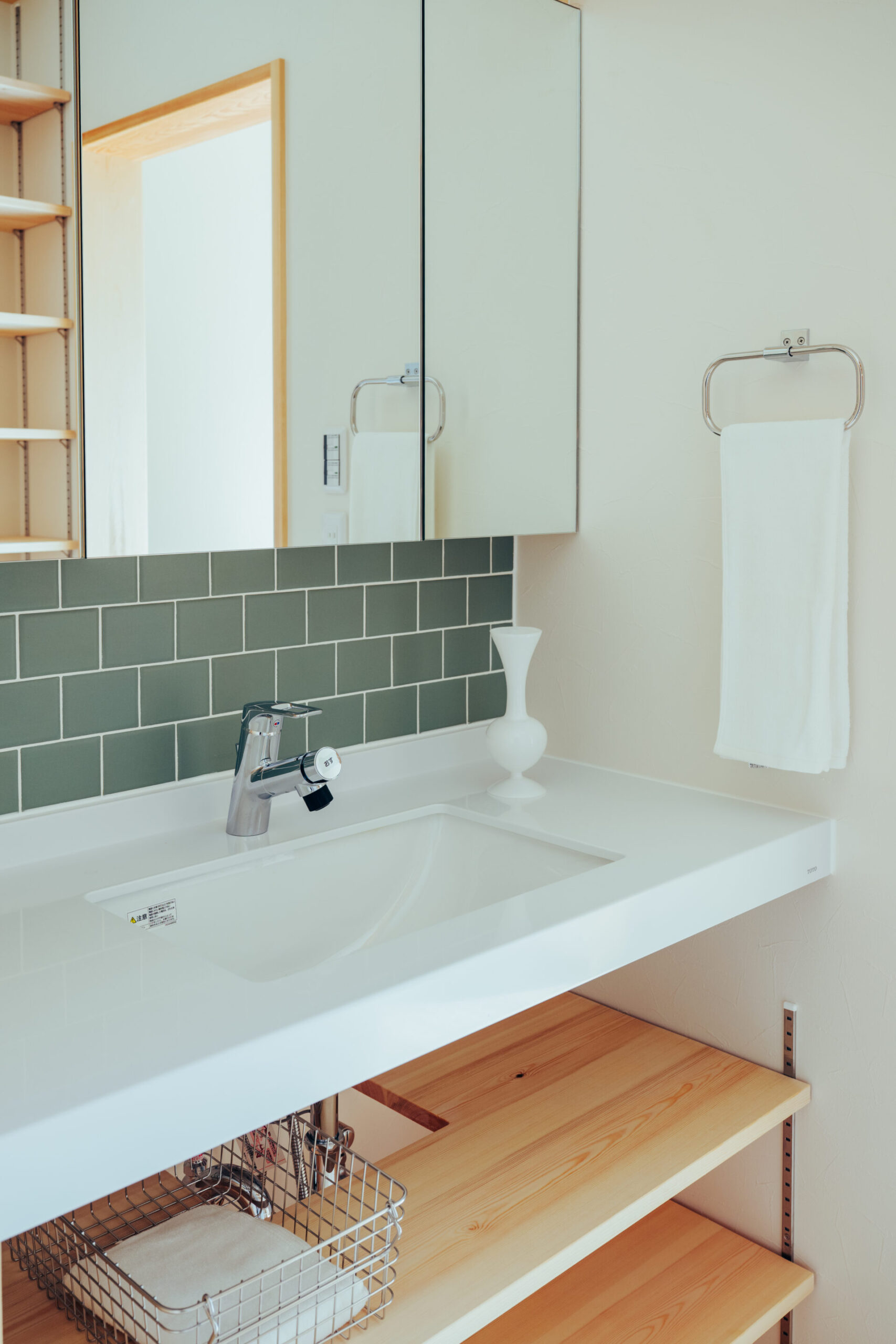 LDK空間とプライベート空間をつなぐ廊下には、ナチュラルな印象の造作洗面台。