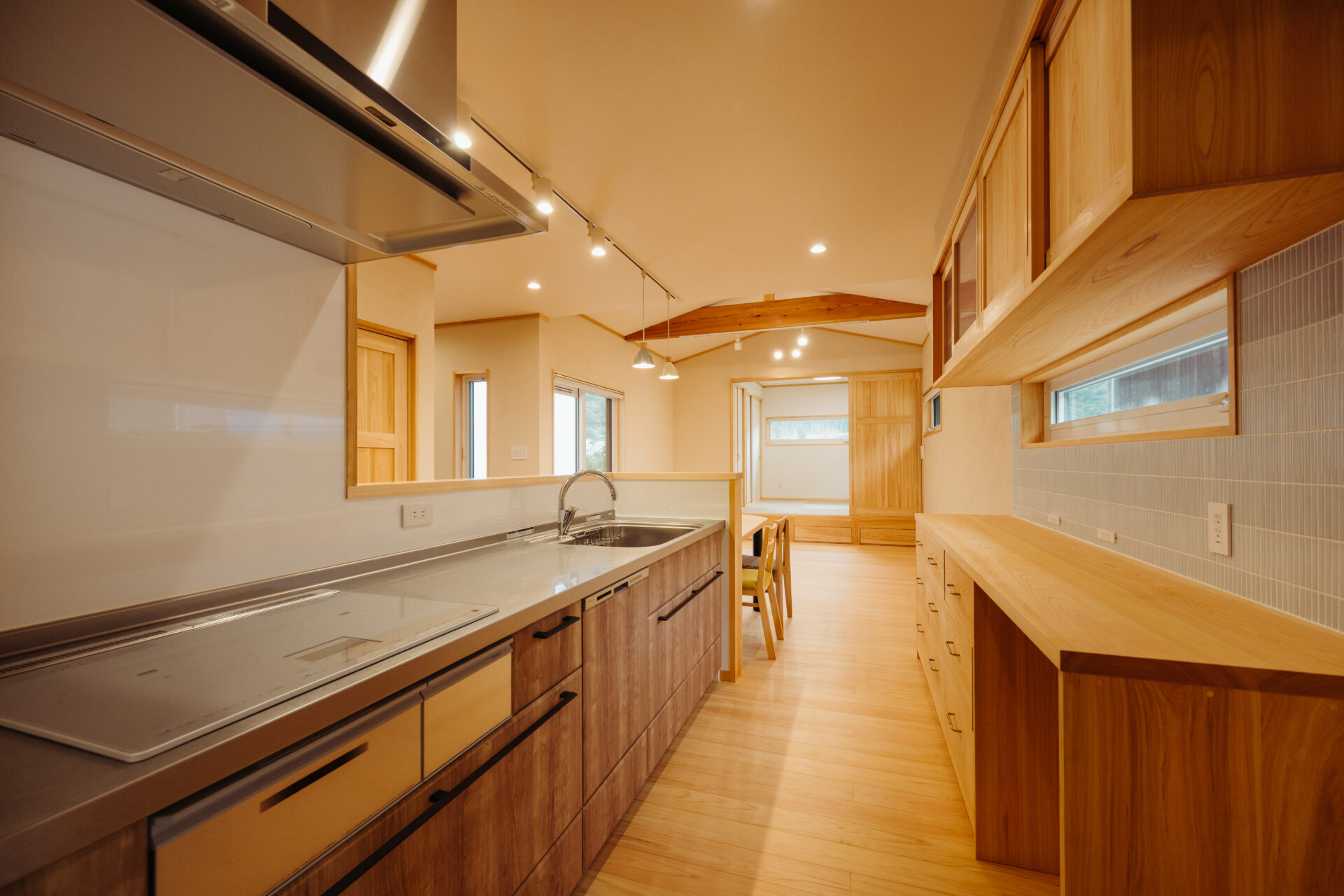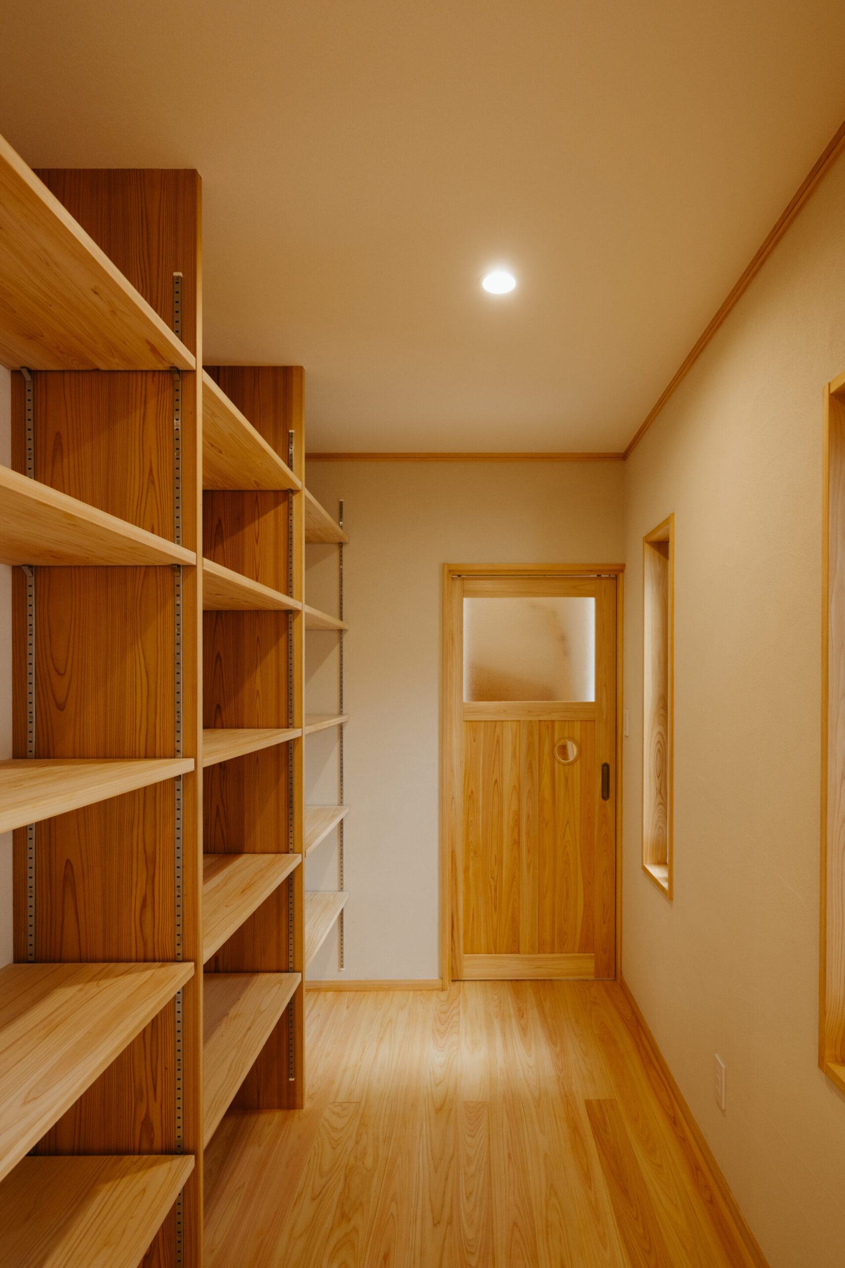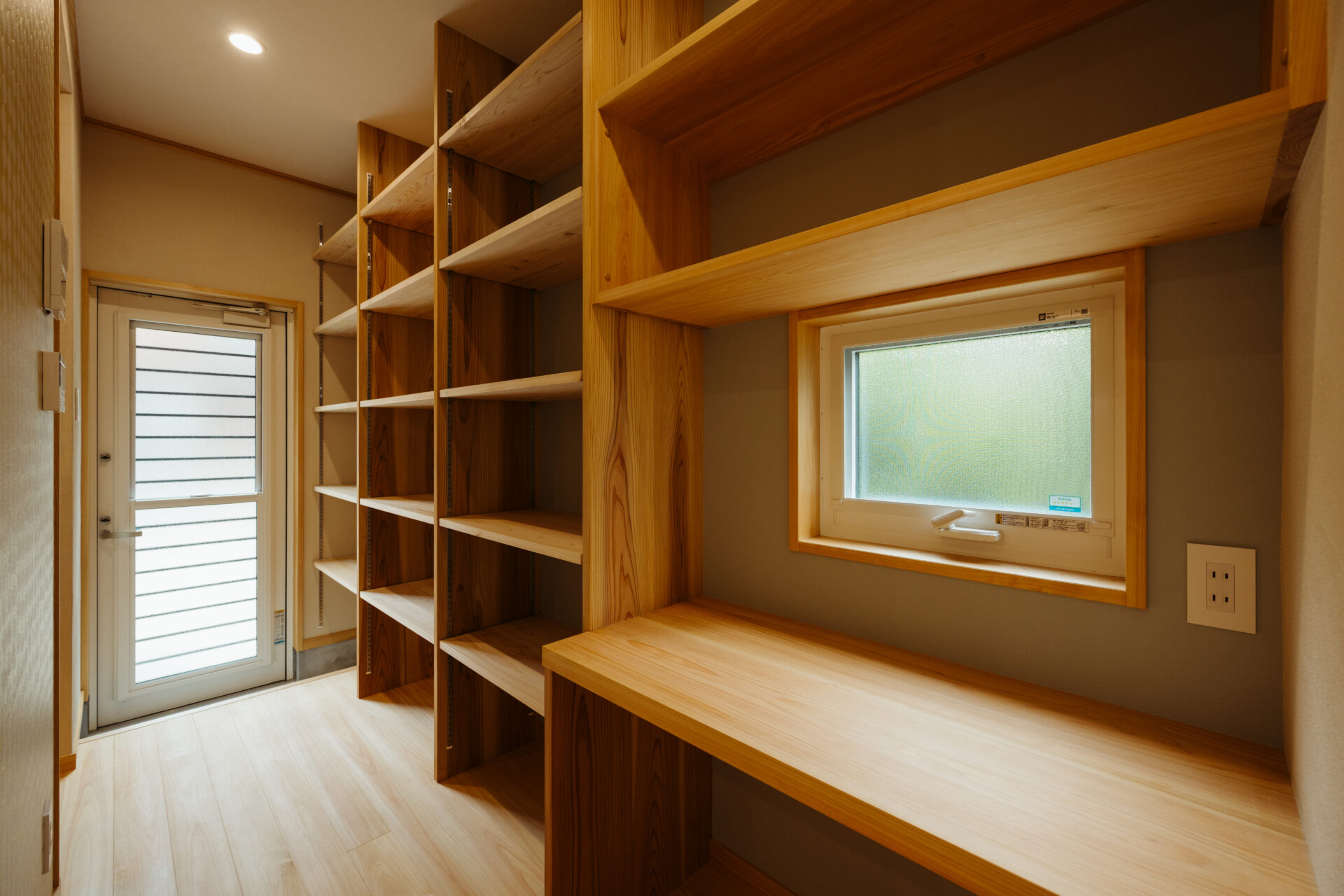 奥には大容量のパントリー。カウンターには窓を設け、ちょっとした作業ができるスペースになりました。