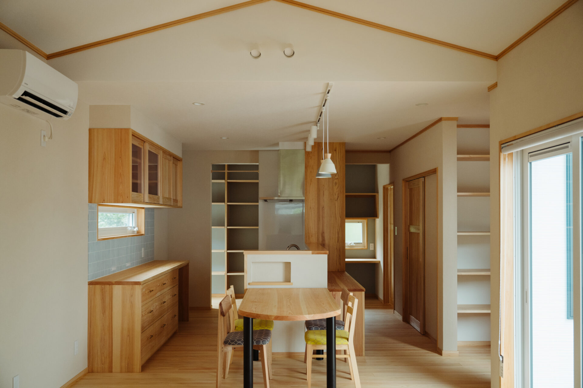切妻の勾配天井を採用し、開放感たっぷりなLDK。造作のダイニングテーブルや背面収納で温もりのあるナチュラル空間となりました。