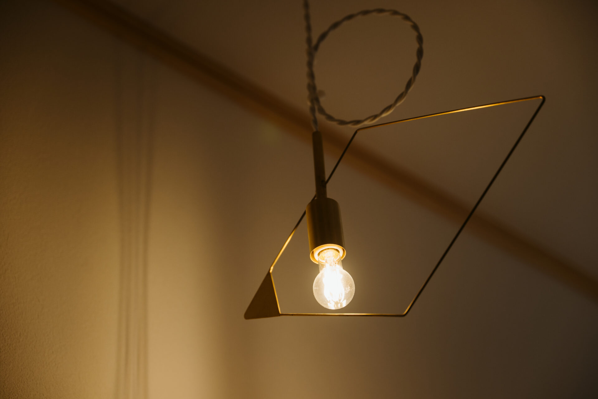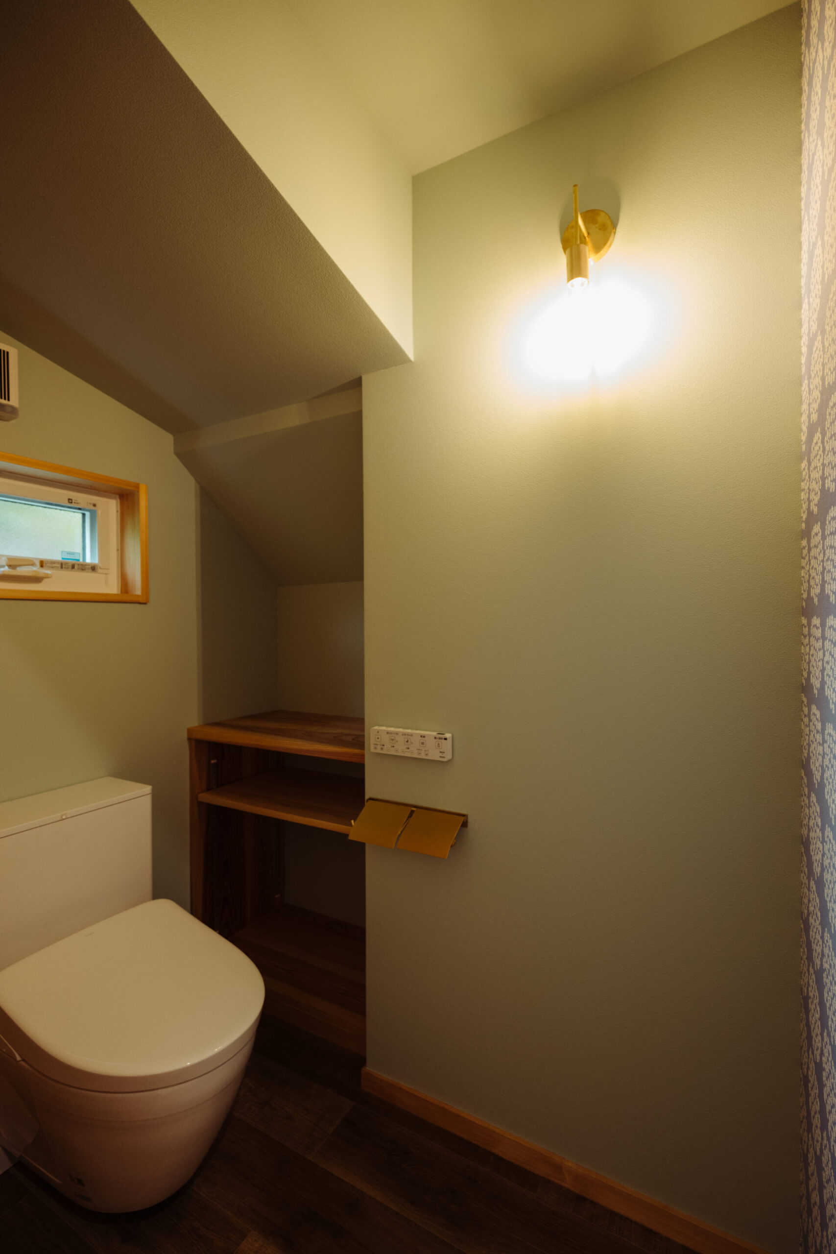 階段下を利用して、お気に入りの照明とクロスを使ったトイレを配置。