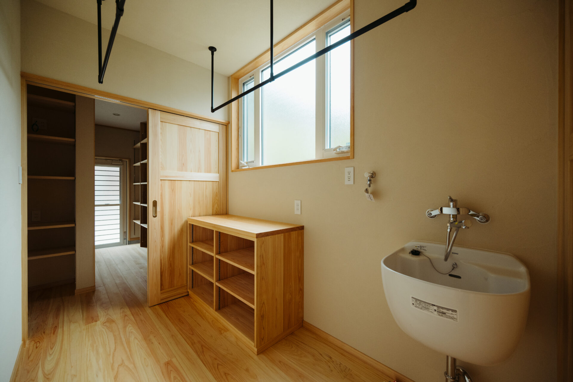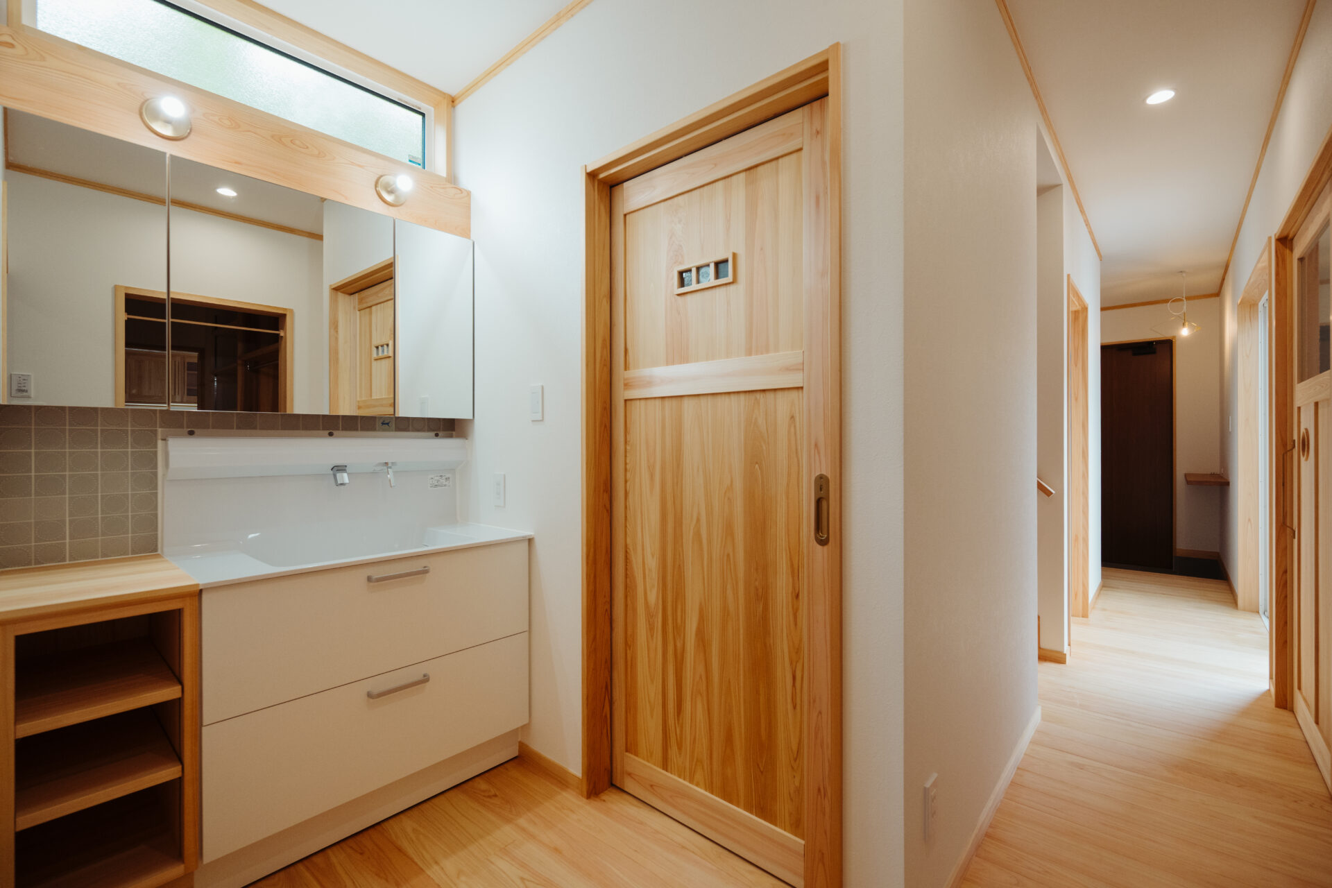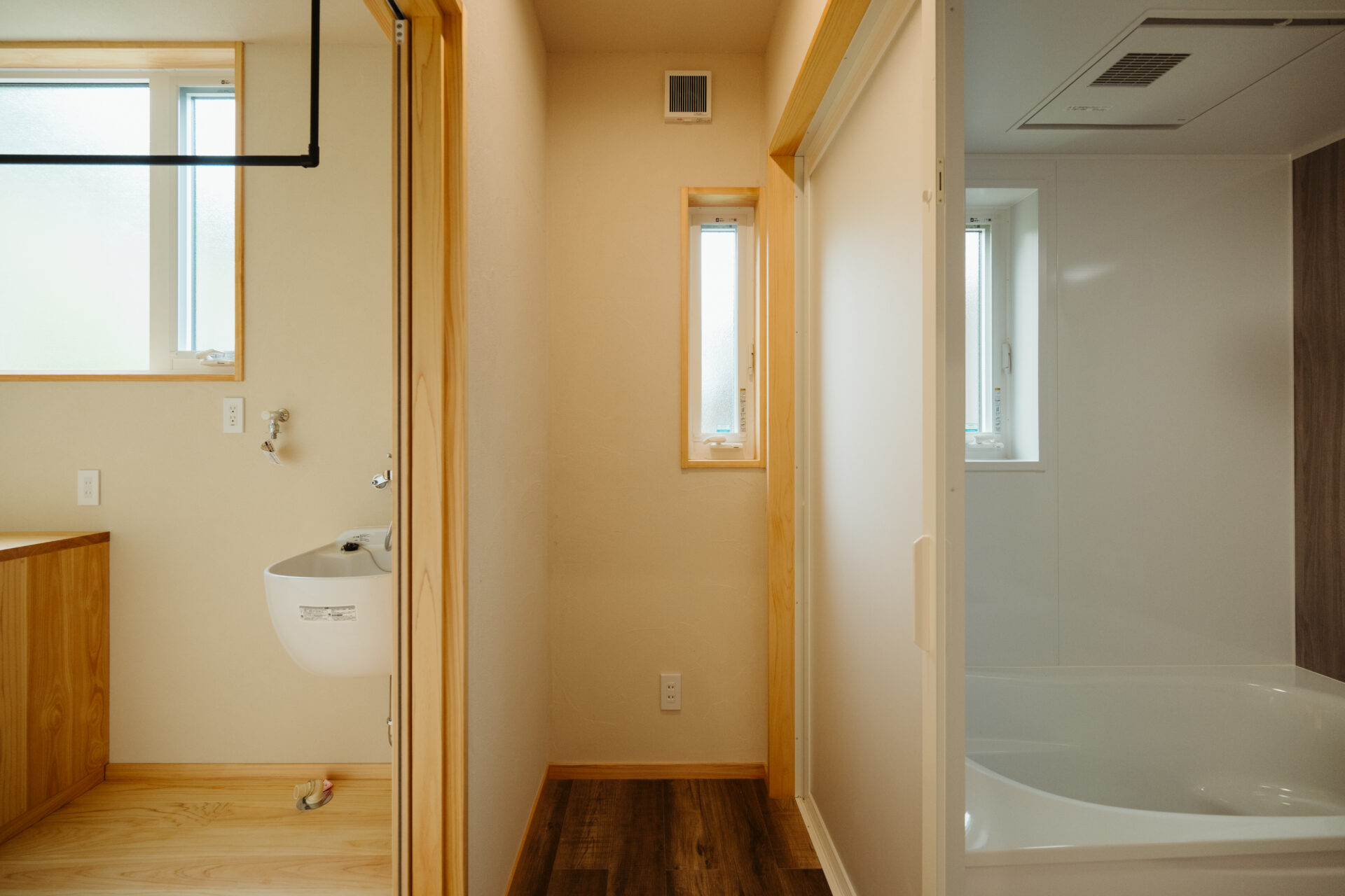 玄関から奥に進んだ場所には水回りをまとめました。造作と既製品を組み合わせた使い勝手の良い洗面台には、優しい光を取り入れるためFIX窓も設けました。