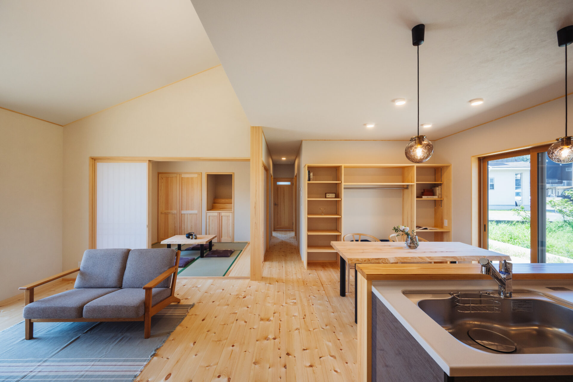 リビングは勾配天井を採用し、シンプルで開放感のあるLDK空間になりました。リビングの先には二つ目のトイレと子ども部屋が3部屋あります。