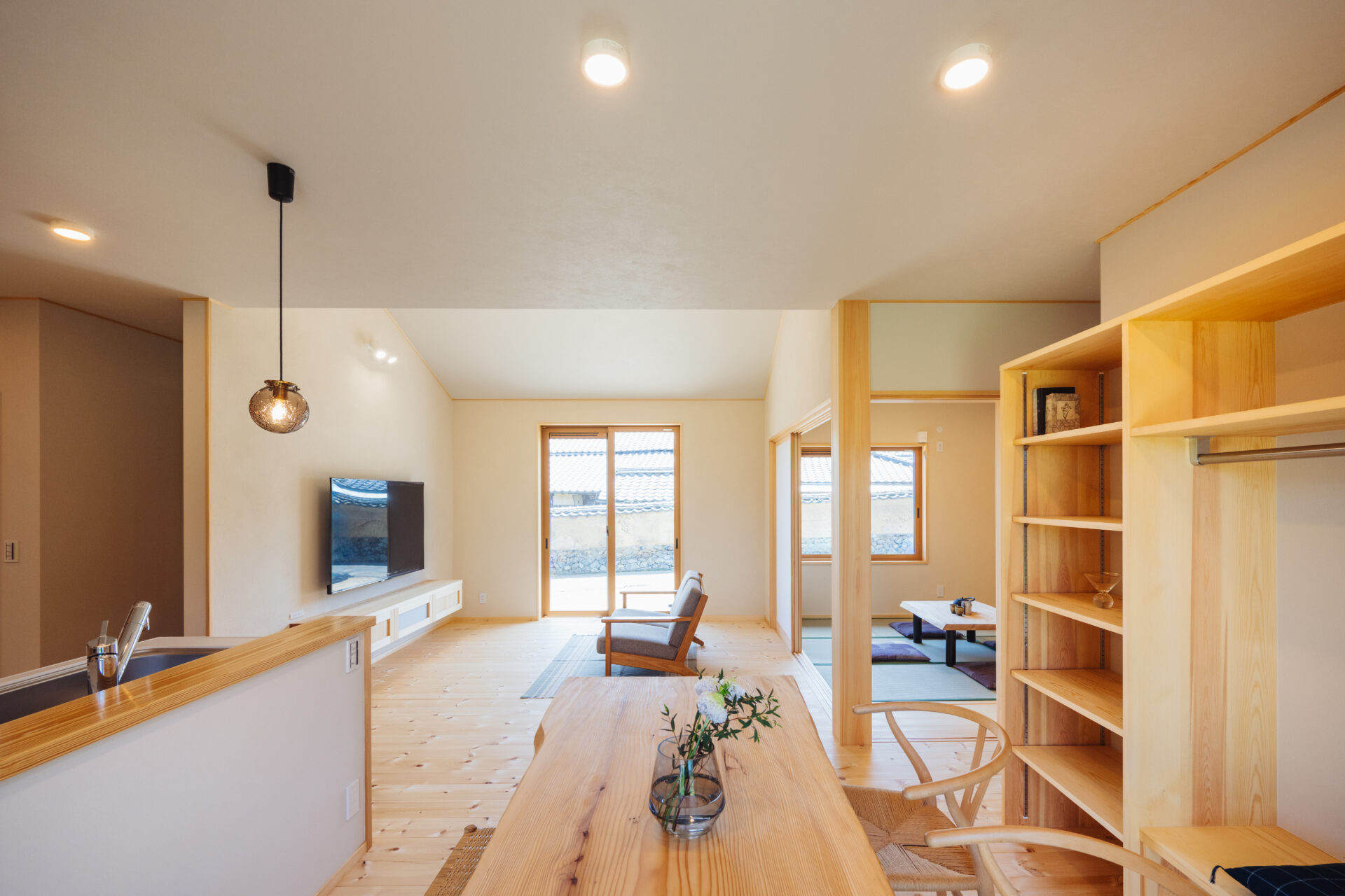 リビングに和室を隣接させているため、空間がより広く感じられます。テレビボードやテーブルなどの造作家具で整ったあたたかい空間です。