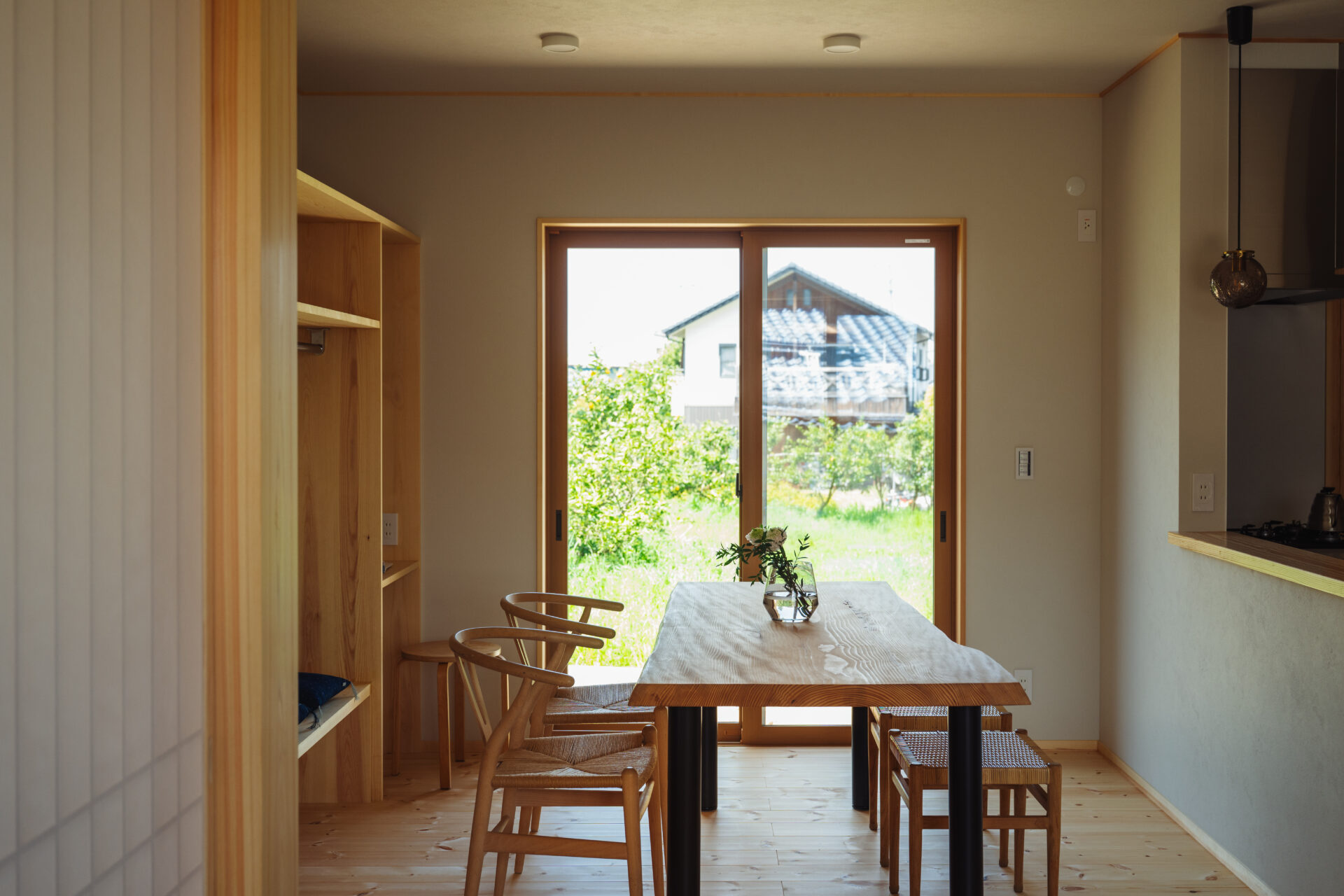 ダイニングには造作の収納棚と子供たちの勉強スペースを設けました。