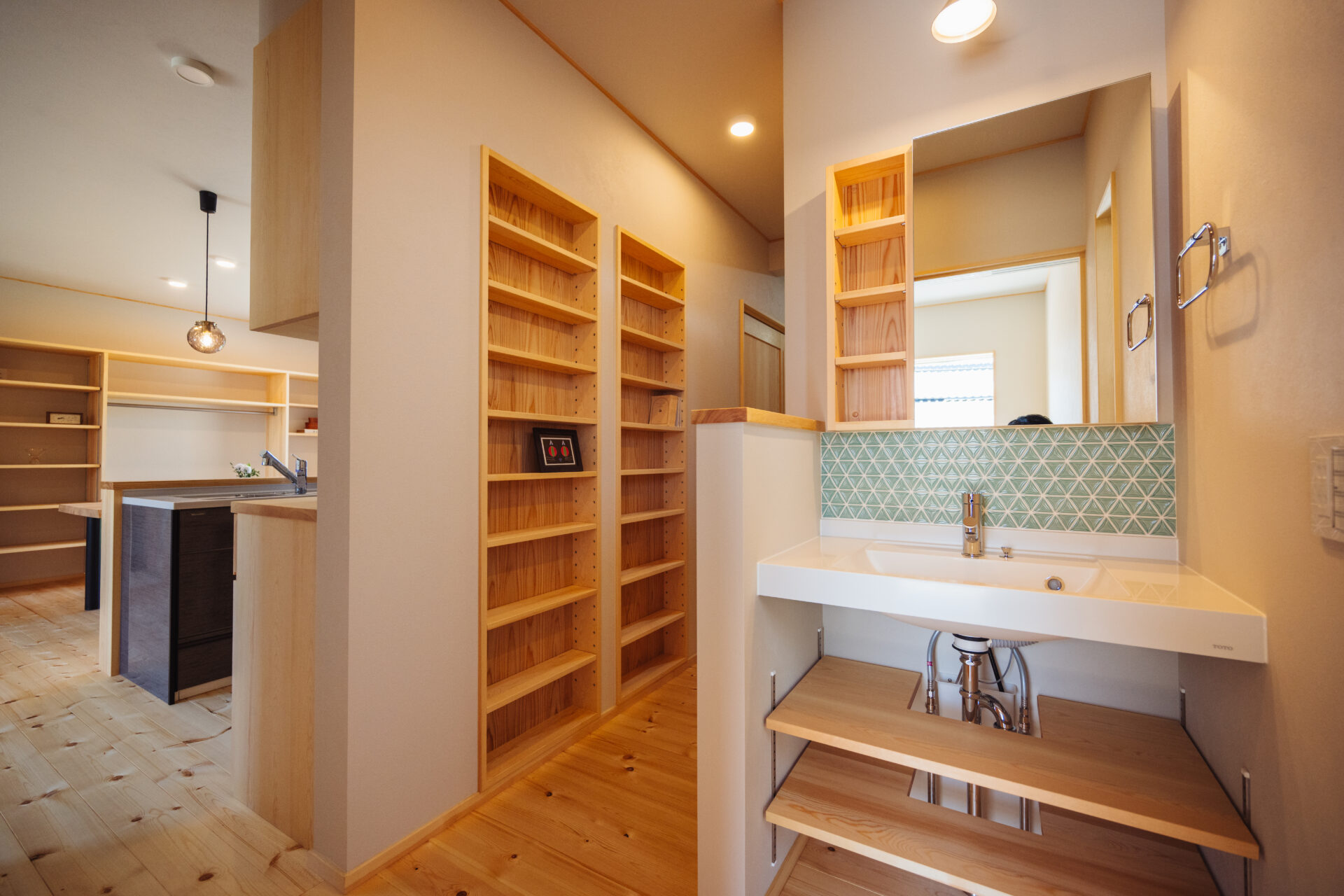 帰宅導線を考えた洗面台、その奥はWICと水回りスペースがあります。廊下の壁を利用して本棚も完備。