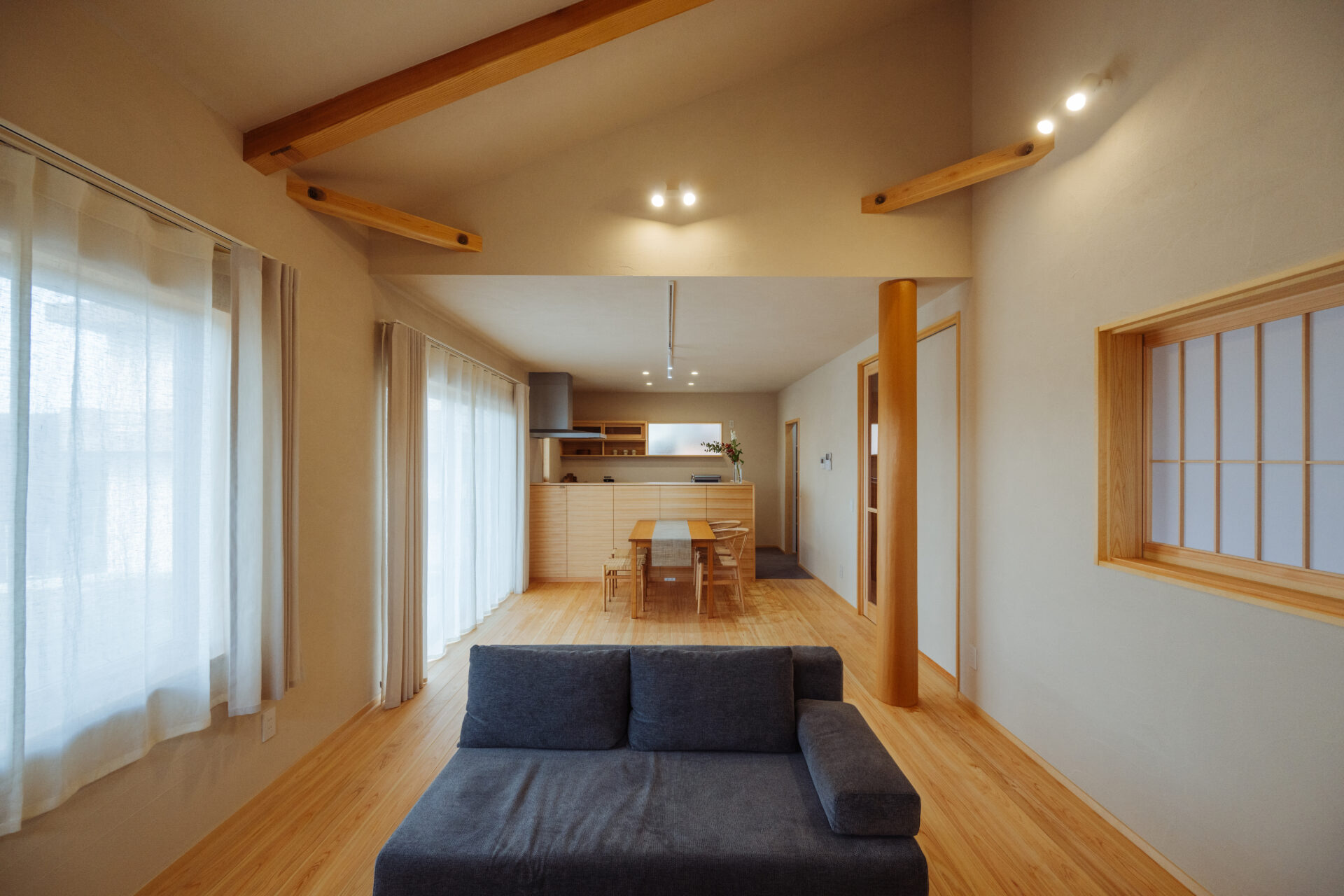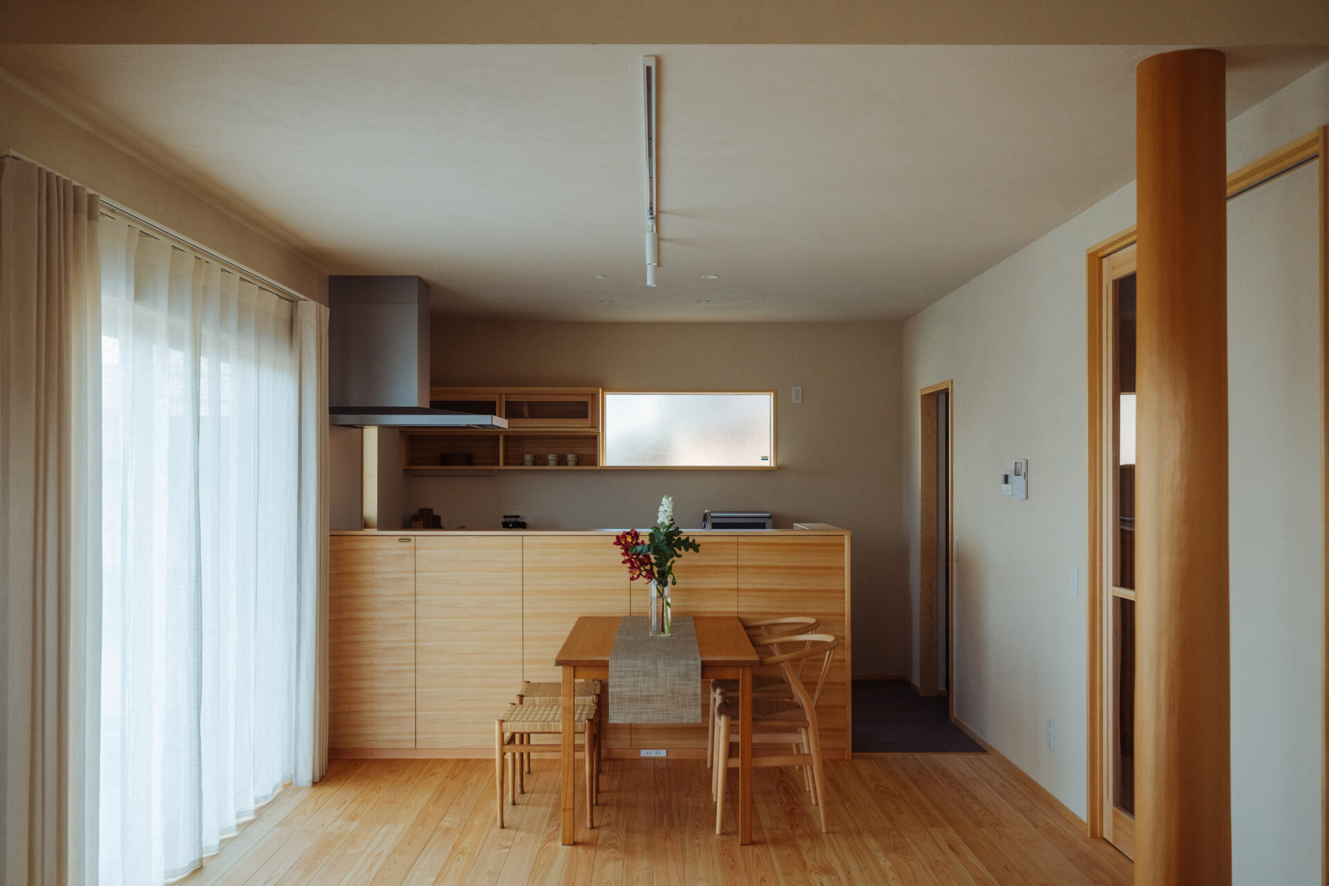 LDKは、節のない檜の床や無垢の木のキッチン、磨き丸太で木の温もりを感じるナチュラルな空間になりました。