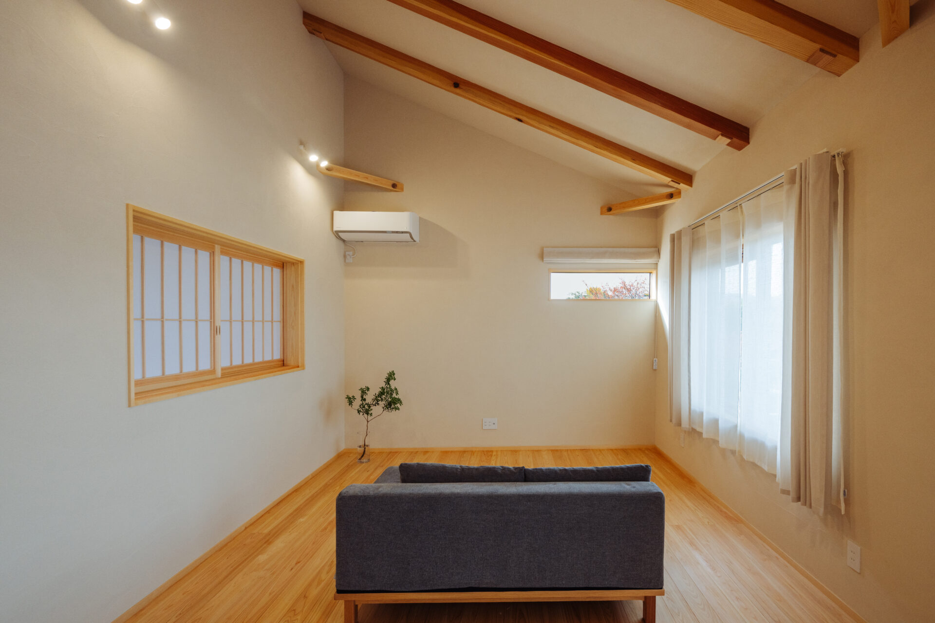 リビングの壁面にはやさしい光を通す障子窓。その先には寝室を設けています。