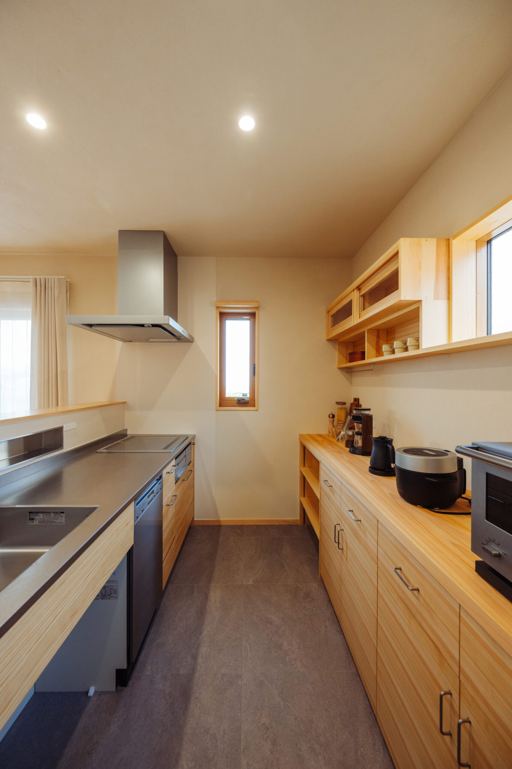 キッチンにはフラッシュの腰壁を造作。フラットな面と美しい木目のラインが、ダイニングキッチン全体をスタイリッシュに見せてくれます。