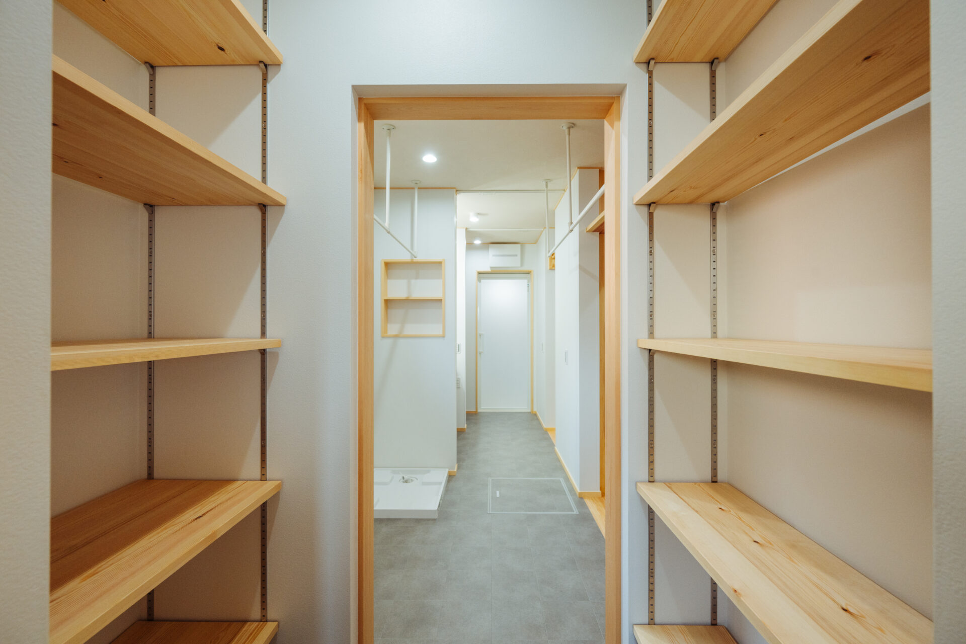 キッチンの横にはパントリーを設け、そのまま水回りとWICへとつながる回遊導線を採用。最短距離で動ける間取りで、家事も収納もスムーズに。