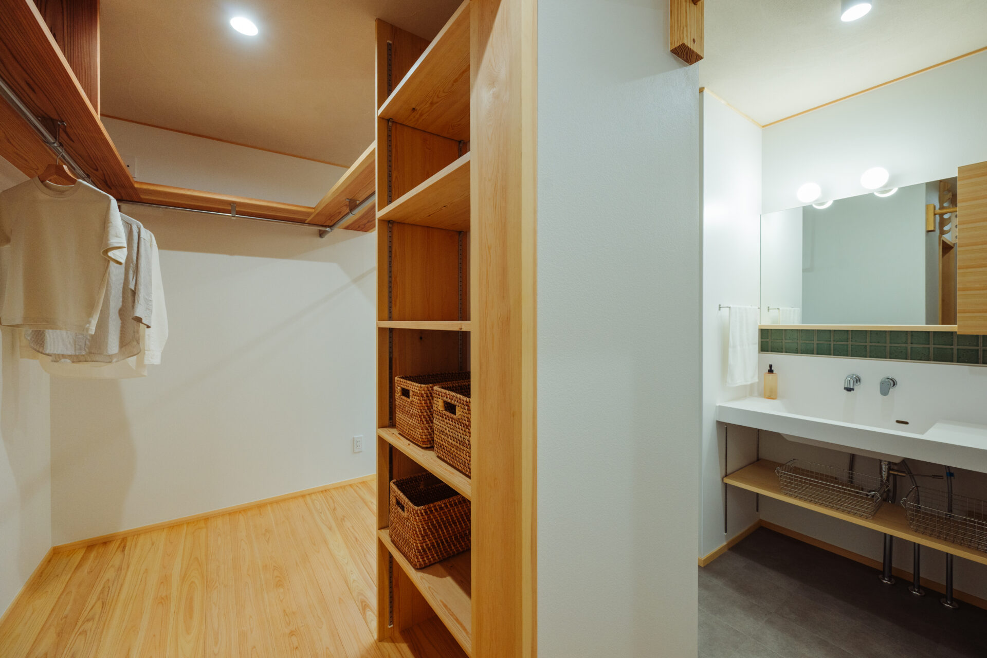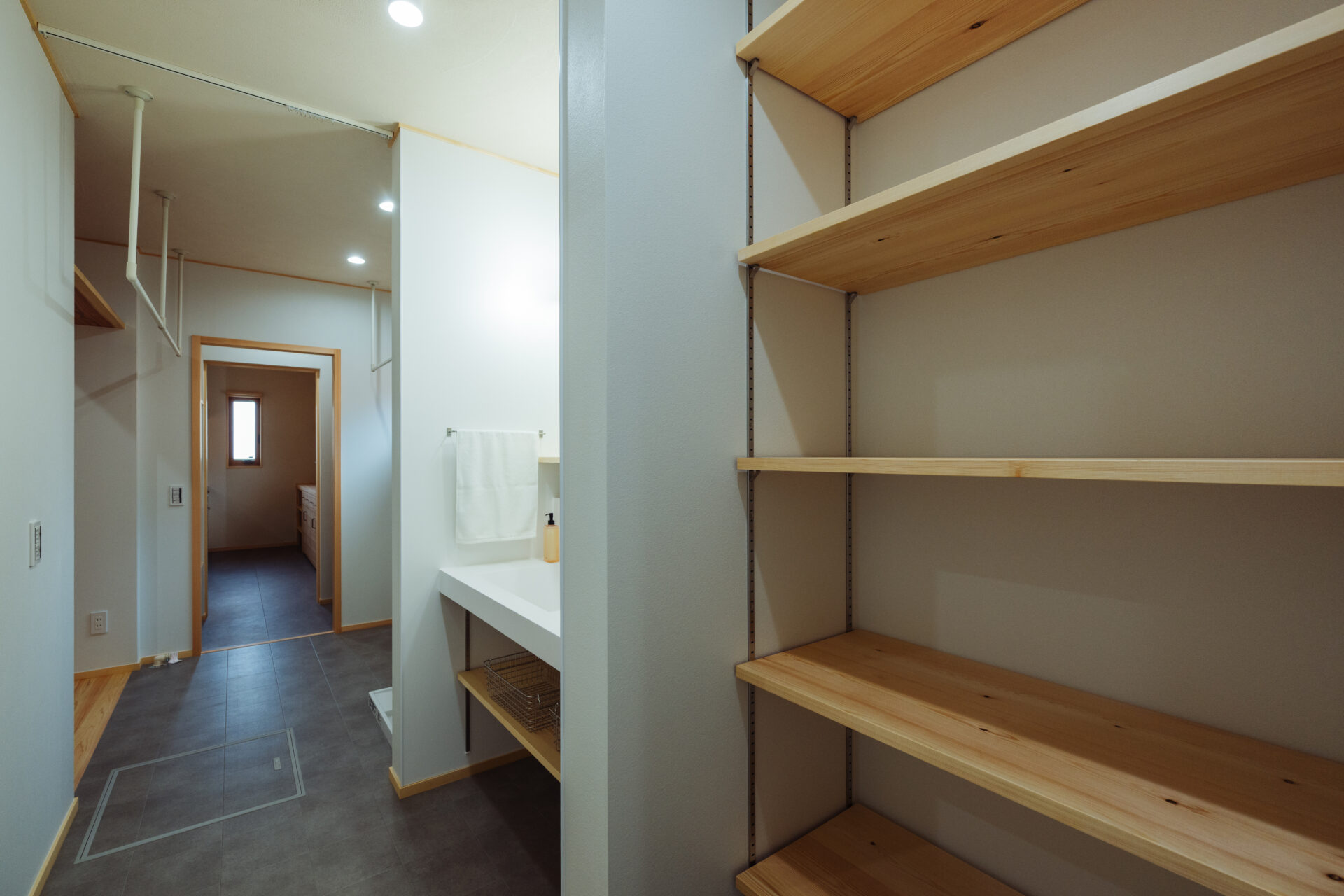 大容量のWICを設けているため、一階の収納はここでほぼ完結。散らかりやすい日用品や衣類もまとめて収納し、生活空間をすっきり保てます。