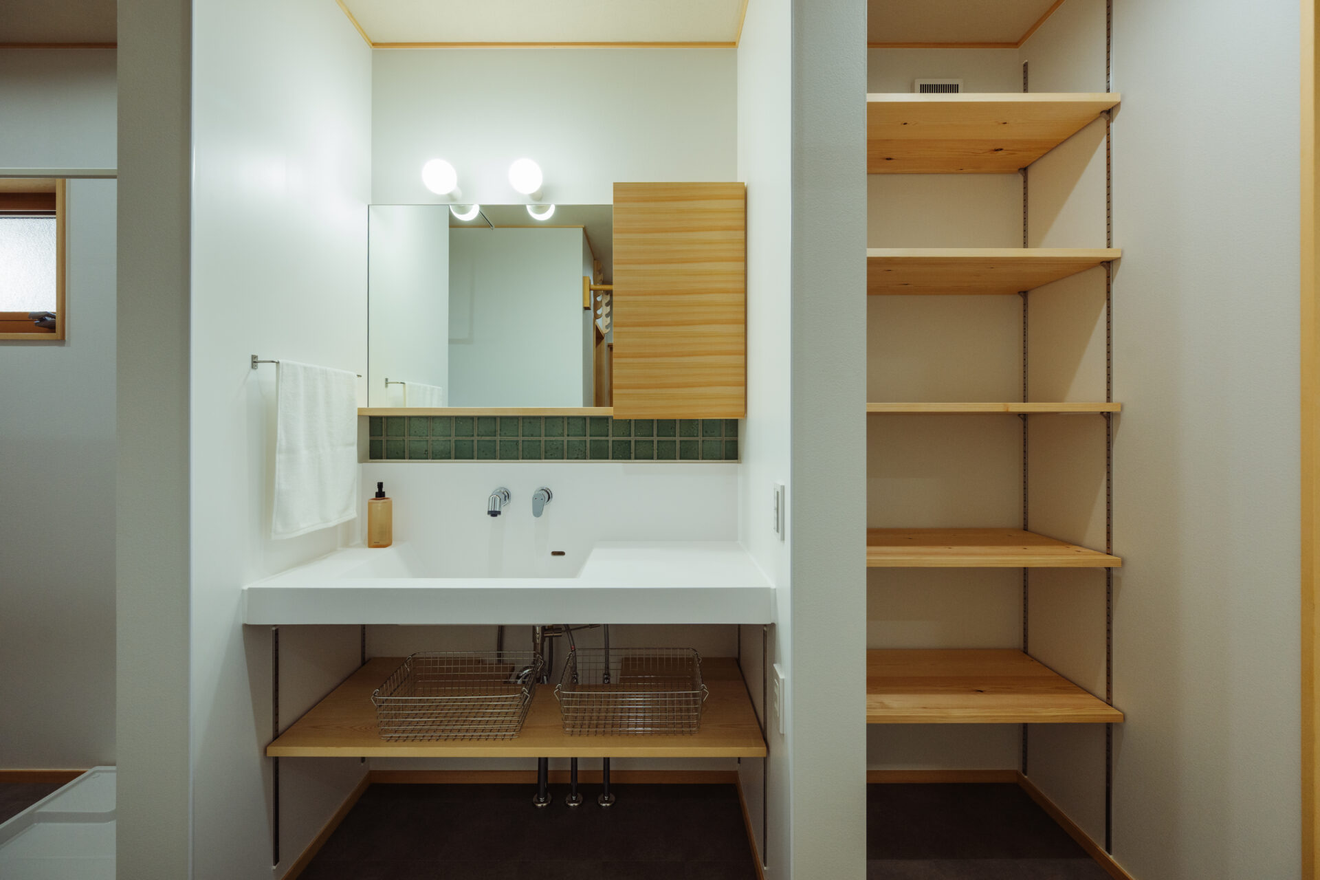 脱衣スペースと洗面、ランドリースペースはカーテンで区切ることができます。必要なときだけ視線を遮れるので、家族が同時に使う場面でも気兼ねなく動けます。