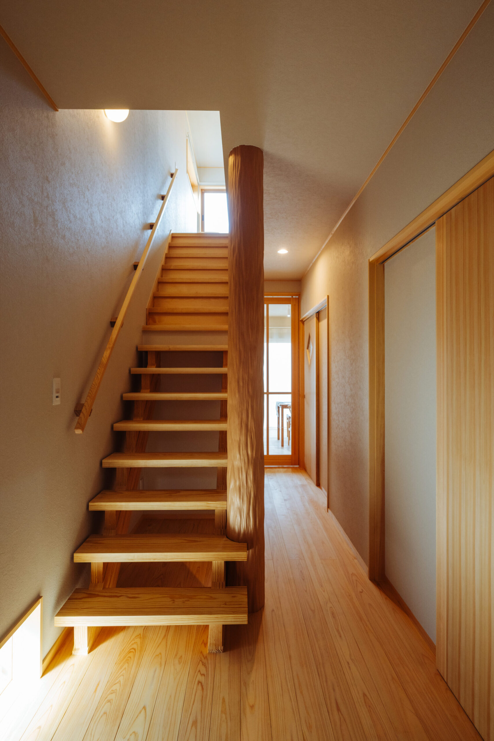 玄関を入るとすぐに磨き丸太と階段。奥にはLDK、隣には収納と水回りを配置しています。