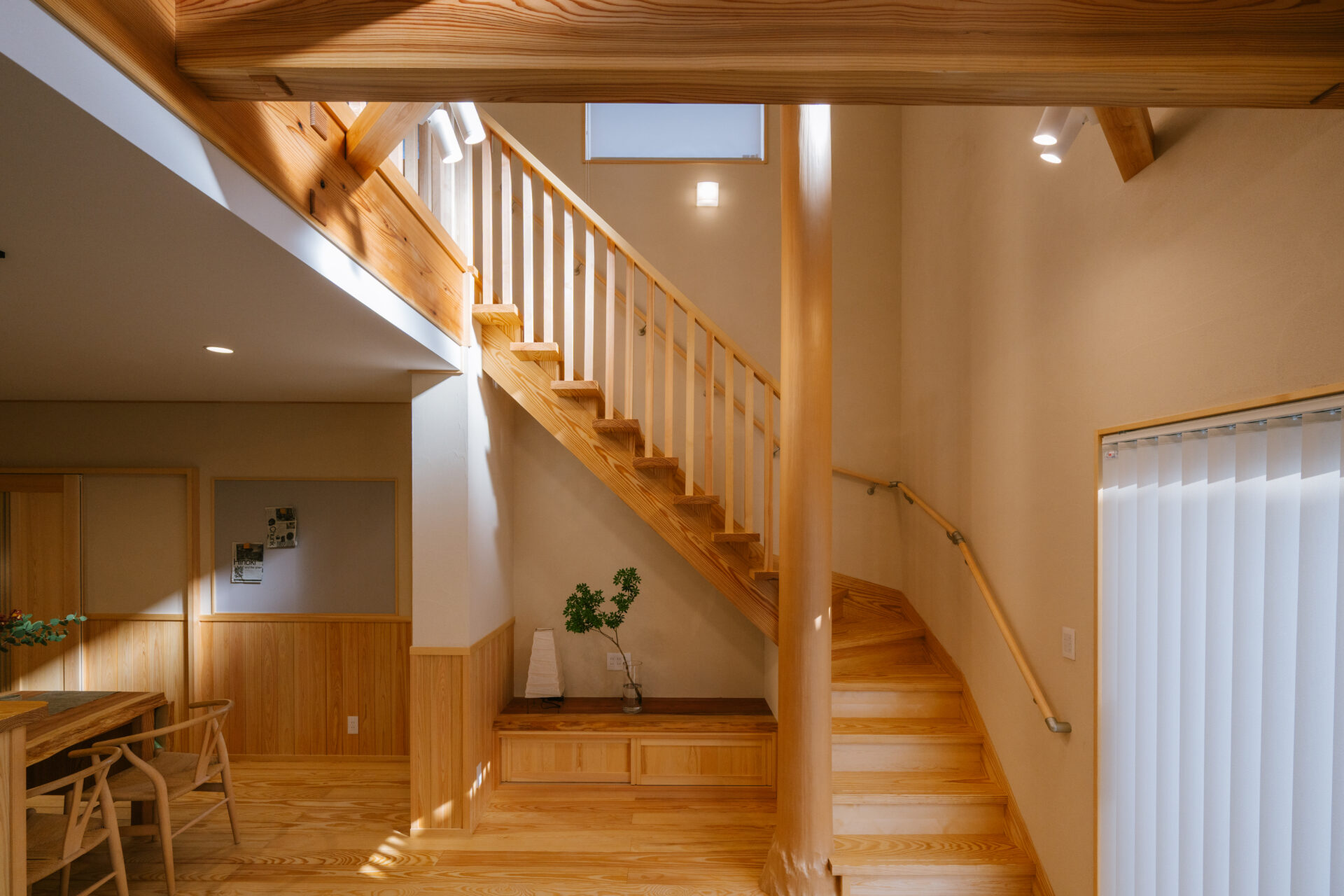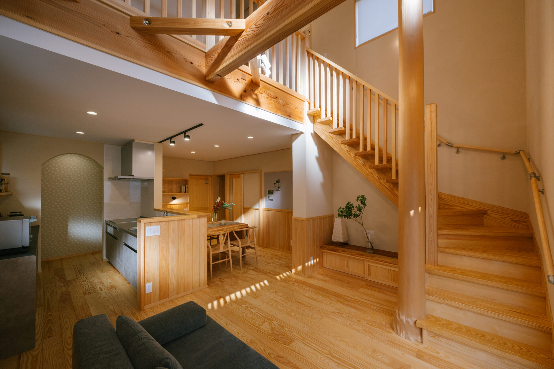 木の温もりに包まれた暮らしやすいコンパクトな家が完成しました。腰板や造作家具、磨き丸太などで木の温もりを最大限に感じながら、限られた敷地でも、お子様がのびのび成長できる住まいとなりました。