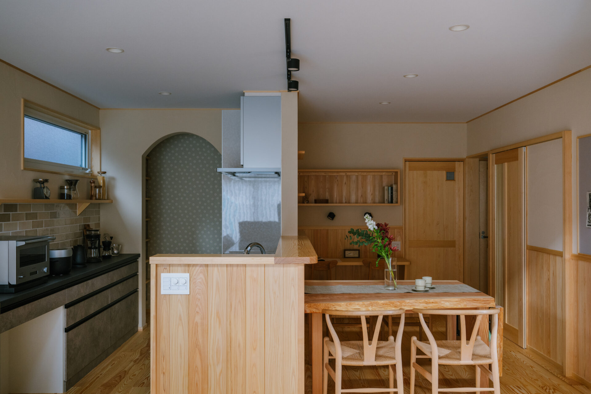 共働きの暮らしに合わせて家事動線を考えたダイニングキッチン。柔らかな印象を与えるキッチンの奥のR壁は、パントリーと冷蔵庫置き場です。動線を短くまとめ、家事をスムーズに行えるよう工夫しました。ダイニング奥は、水回りと収納スペースを配置。